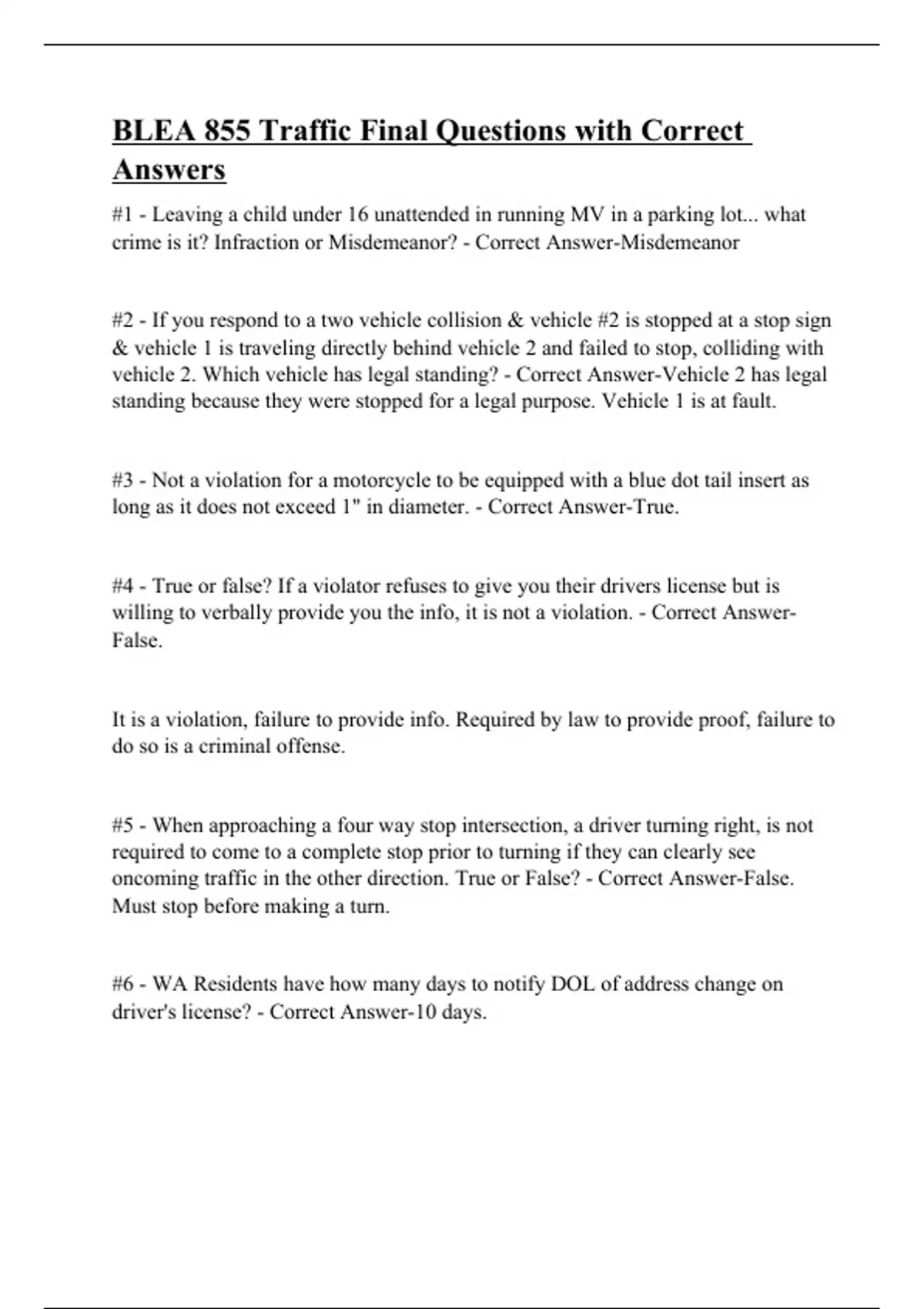 #1 - Leaving a child under 16 unattended in running MV in a parking lot... what crime is it? Infraction or Misdemeanor? - Correct Answer-Misdemeanor #2 - If you respond to a two vehicle collision & vehicle #2 is stopped at a stop sign & vehicle 1 is traveling directly behind vehicle 2 and failed to stop, colliding with vehicle 2. Which vehicle has legal standing? - Correct Answer-Vehicle 2 has legal standing because they were stopped for a legal purpose. Vehicle 1 is at fault. #3 - Not a violation for a motorcycle to be equipped with a blue dot tail insert as long as it does not exceed 1" in diameter. - Correct Answer-True. #4 - True or false? If a violator refuses to give you their drivers license but is willing to verbally provide you the info, it is not a violation. - Correct Answer-False. It is a violation, failure to provide info. Required by law to provide proof, failure to do so is a criminal offense. #5 - When approaching a four way stop intersection, a driver turning right, is not required to come to a complete stop prior to turning if they can clearly see oncoming traffic in the other direction. True or False? - Correct Answer-False. Must stop before making a turn.