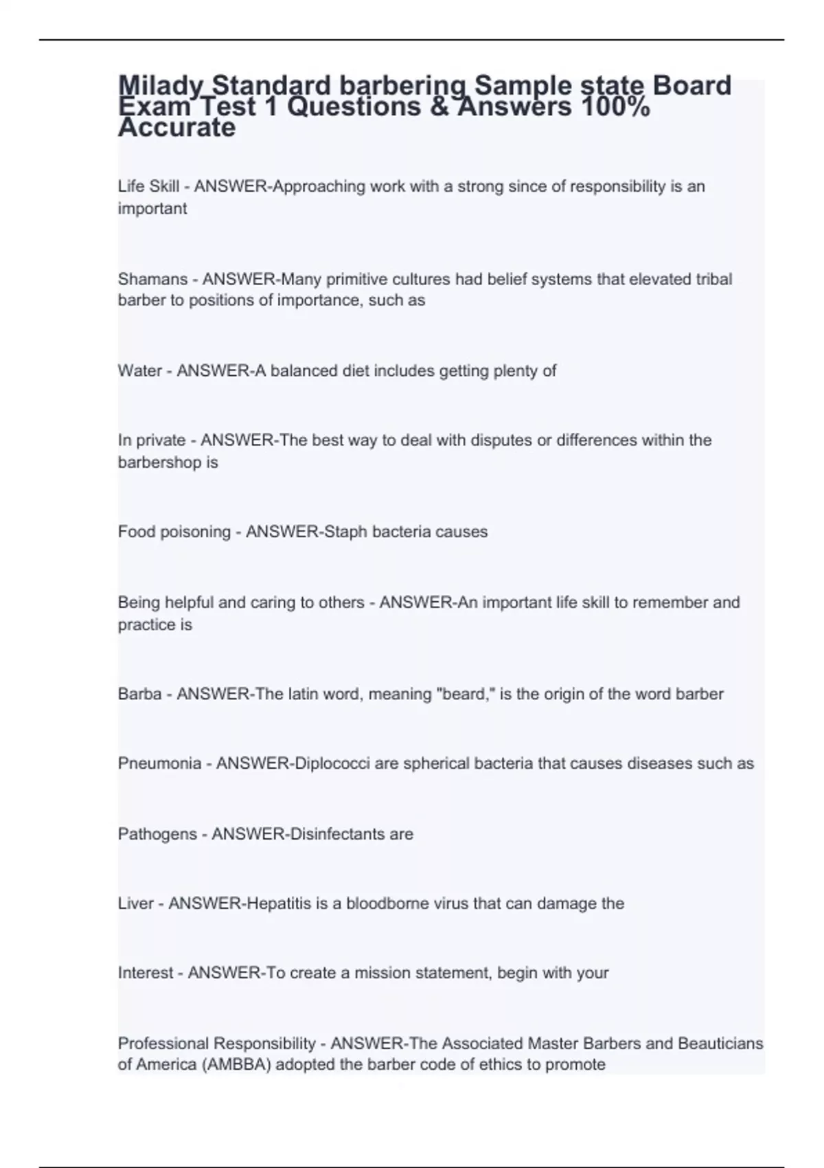Life Skill - ANSWER-Approaching work with a strong since of responsibility is an important Shamans - ANSWER-Many primitive cultures had belief systems that elevated tribal barber to positions of importance, such as Water - ANSWER-A balanced diet includes getting plenty of In private - ANSWER-The best way to deal with disputes or differences within the barbershop is Food poisoning - ANSWER-Staph bacteria causes Being helpful and caring to others - ANSWER-An important life skill to remember and practice is Barba - ANSWER-The latin word, meaning "beard," is the origin of the word barber Pneumonia - ANSWER-Diplococci are spherical bacteria that causes diseases such as Pathogens - ANSWER-Disinfectants are Liver - ANSWER-Hepatitis is a bloodborne virus that can damage the Interest - ANSWER-To create a mission statement, begin with your