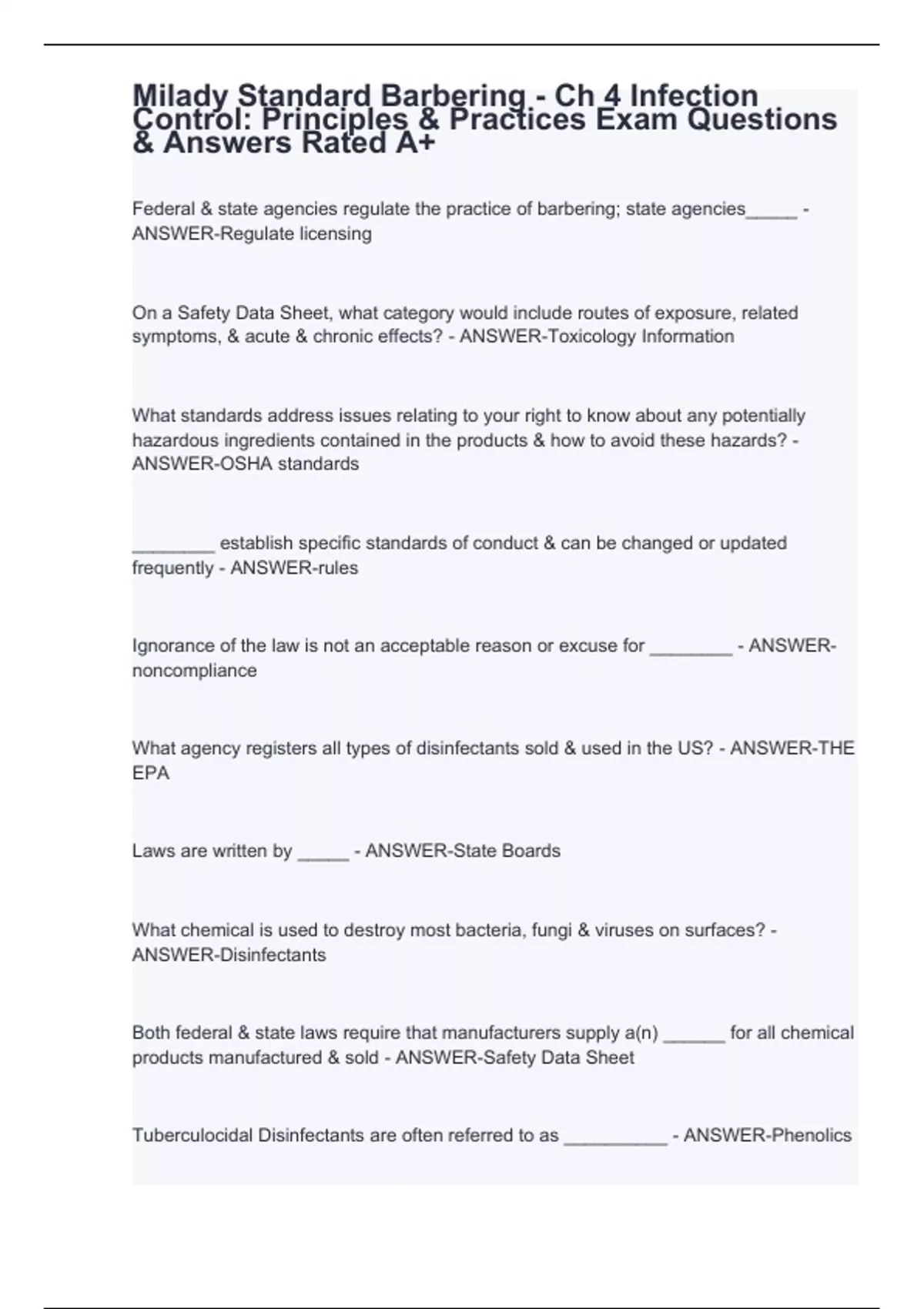 Milady Standard Barbering - Ch 4 Infection Control: Principles & Practices Exam Questions & Answers Rated A+