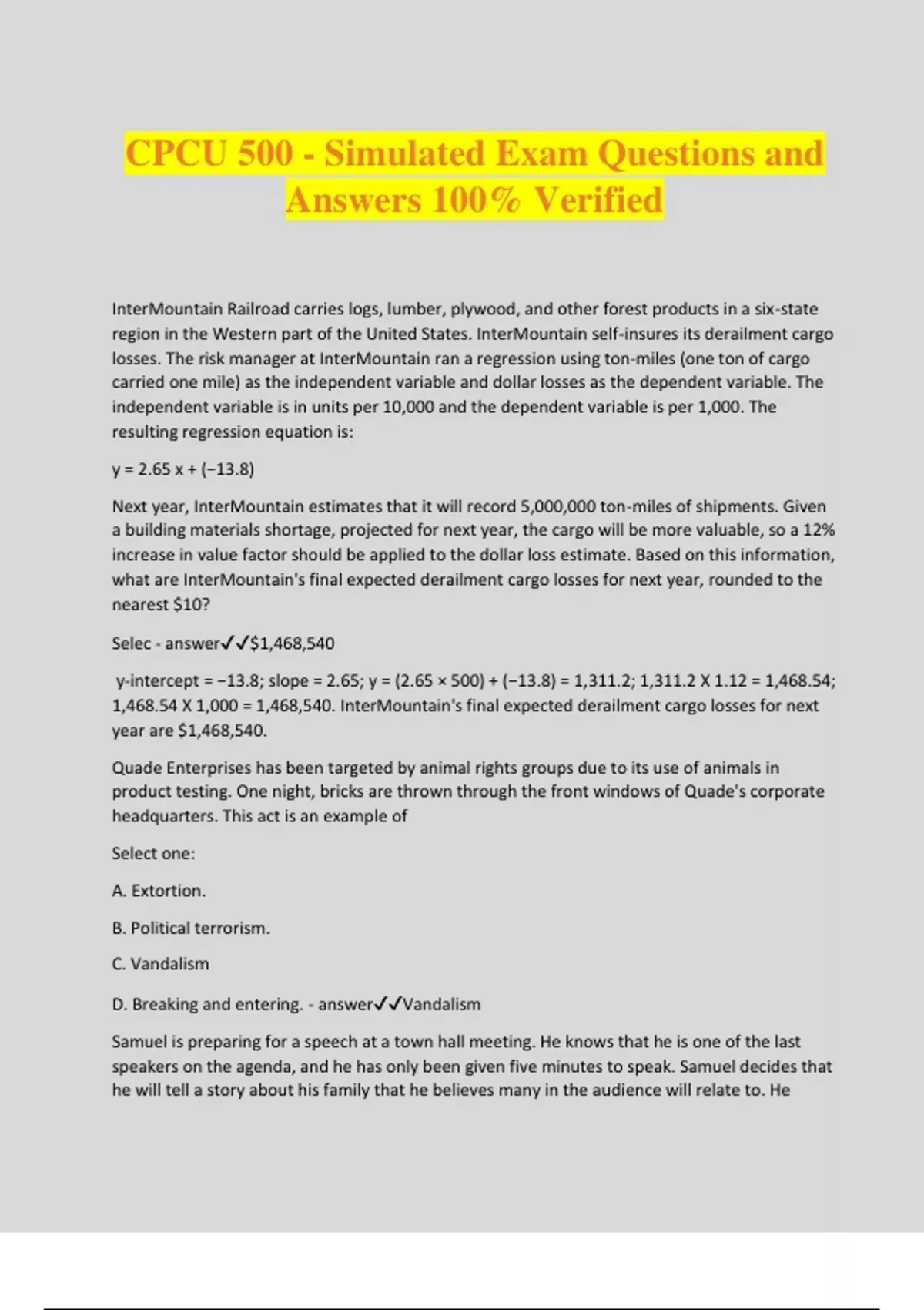 CPCU 500 - Simulated Exam Questions and Answers 100% Verified InterMountain Railroad carries logs, lumber, plywood, and other forest products in a six-state region in the Western part of the United States. InterMountain self-insures its derailment cargo losses. The risk manager at InterMountain ran a regression using ton-miles (one ton of cargo carried one mile) as the independent variable and dollar losses as the dependent variable. The independent variable is in units per 10,000 and the dependent variable is per 1,000. The resulting regression equation is: y = 2.65 x + (−13.8) Next year, InterMountain estimates that it will record 5,000,000 ton-miles of shipments. Given a building materials shortage, projected for next year, the cargo will be more valuable, so a 12% increase in value factor should be applied to the dollar loss estimate. Based on this information, what are InterMountain's final expected derailment cargo losses for next year, rounded to the nearest $10? Selec - answer$1,468,540 y-intercept = −13.8; slope = 2.65; y = (2.65 × 500) + (−13.8) = 1,311.2; 1,311.2 X 1.12 = 1,468.54; 1,468.54 X 1,000 = 1,468,540. InterMountain's final expected derailment cargo losses for next year are $1,468,540. Quade Enterprises has been targeted by animal rights groups due to its use of animals in product testing. One night, bricks are thrown through the front windows of Quade's corporate headquarters. This act is an example of Select one: A. Extortion. B. Political terrorism. C. Vandalism D. Breaking and entering. - answerVandalism Samuel is preparing for a speech at a town hall meeting. He knows that he is one of the last speakers on the agenda, and he has only been given five minutes to speak. Samuel decides that he will tell a story about his family that he believes many in the audience will relate to. He hopes the story will leave the audience with a sense of anger. Which one of the following modes of persuasion is Samuel using? Select one: A. Axios B. Pathos C. Ethos D. Logos - answerPathos Samuel is making use of pathos or emotion. By telling a relatable story, he is likely to stir up people's emotions. Leaving with a sense of fear, they are more likely to remember what was said and take action. Elliott Industries has just invested a large sum in new, highly-sophisticated computer equipment and building renovations. The building renovations created an airtight, oxygen-free, vacuum-sealed room to house the expensive equipment. For fire losses initiating in that room, the airtight, oxygen-free, vacuum-sealed room is an example of Select one: A. Loss prevention. B. Avoidance. C. Loss reduction D. Separation. - answerLoss prevention For fire losses, the airtight, oxygen-free, vacuum-sealed room is an example of loss prevention Which one of the following statements best describes the shareholders' equity section of the balance sheet? Select one: A. Shareholders' equity decreases by the amount of debt satisfied during the year. B. Shareholders' equity is negative when the entity reports a net loss for the year. C. Shareholders' equity is negative when liabilities exceed assets. D. Shareholders' equity is an asset of the business entity. - answerShareholders' equity is negative when liabilities exceed assets Geneva Trucking installed telematics devices in all of its trucks. The sensors in two trucks indicate a frequency of hard braking. Which one of the following types of indicator does this information provide for Geneva Trucking? Select one: A. Control indicator B. Generic indicator C. Leading indicator D. Lagging indicator - answerLeading indicator The information from the telematics devices provides a leading indicator for Geneva. Leading indicators identify issues before losses occur. By providing safety training for the drivers of these two trucks, the organization may be able to prolong the life of the brakes, and prevent accidents on the road. The broad form of the hold-harmless agreement attempts to Select one: A. Place all responsibility for negligent acts on the transferor. B. Place all financial consequences of potential losses on the transferee. C. Transfer all financial consequences of potential losses to the transferor. D. Eliminate the possibility of negligence on the part of the transferee. - answerPlace all financial consequences of potential losses on the transferee. HVAC Supply Company has decided to promote a new brand of air conditioning unit. The manufacturer of the new units claims that they are lighter, more efficient, and less expensive than the two well-known brands that HVAC Supply Company currently sell to customers. HVAC Supply Company is hoping that the lower cost will attract new customers. HVAC Supply Company will be exposed to which one of the following types of strategic risk? Select one: A. Acquisition risk B. Marketing risk C. Liquidity risk D. Procurement risk - answerMarketing risk