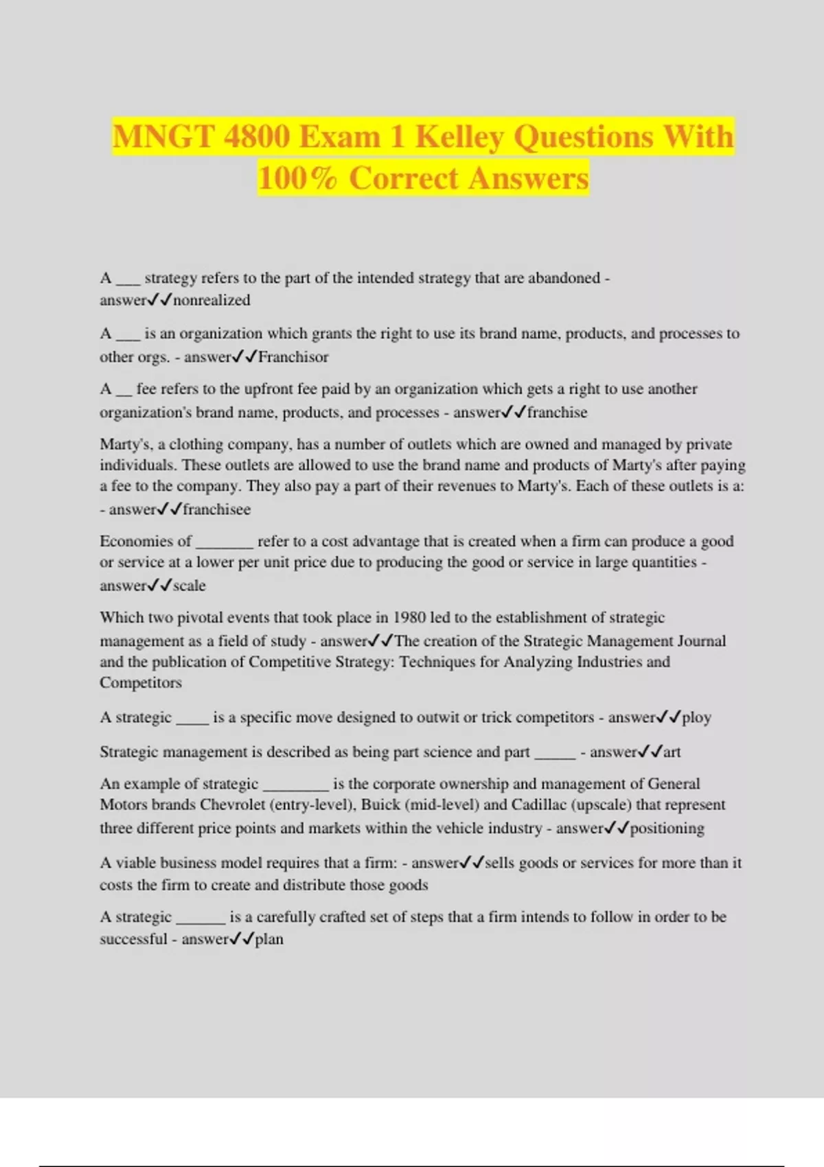 MNGT 4800 Exam 1 Kelley Questions With 100% Correct Answers A ___ strategy refers to the part of the intended strategy that are abandoned - answernonrealized A ___ is an organization which grants the right to use its brand name, products, and processes to other orgs. - answerFranchisor A __ fee refers to the upfront fee paid by an organization which gets a right to use another organization's brand name, products, and processes - answerfranchise Marty's, a clothing company, has a number of outlets which are owned and managed by private individuals. These outlets are allowed to use the brand name and products of Marty's after paying a fee to the company. They also pay a part of their revenues to Marty's. Each of these outlets is a: - answerfranchisee Economies of _______ refer to a cost advantage that is created when a firm can produce a good or service at a lower per unit price due to producing the good or service in large quantities - answerscale Which two pivotal events that took place in 1980 led to the establishment of strategic management as a field of study - answerThe creation of the Strategic Management Journal and the publication of Competitive Strategy: Techniques for Analyzing Industries and Competitors A strategic ____ is a specific move designed to outwit or trick competitors - answerploy Strategic management is described as being part science and part _____ - answerart An example of strategic ________ is the corporate ownership and management of General Motors brands Chevrolet (entry-level), Buick (mid-level) and Cadillac (upscale) that represent three different price points and markets within the vehicle industry - answerpositioning A viable business model requires that a firm: - answersells goods or services for more than it costs the firm to create and distribute those goods A strategic ______ is a carefully crafted set of steps that a firm intends to follow in order to be successful - answerplan