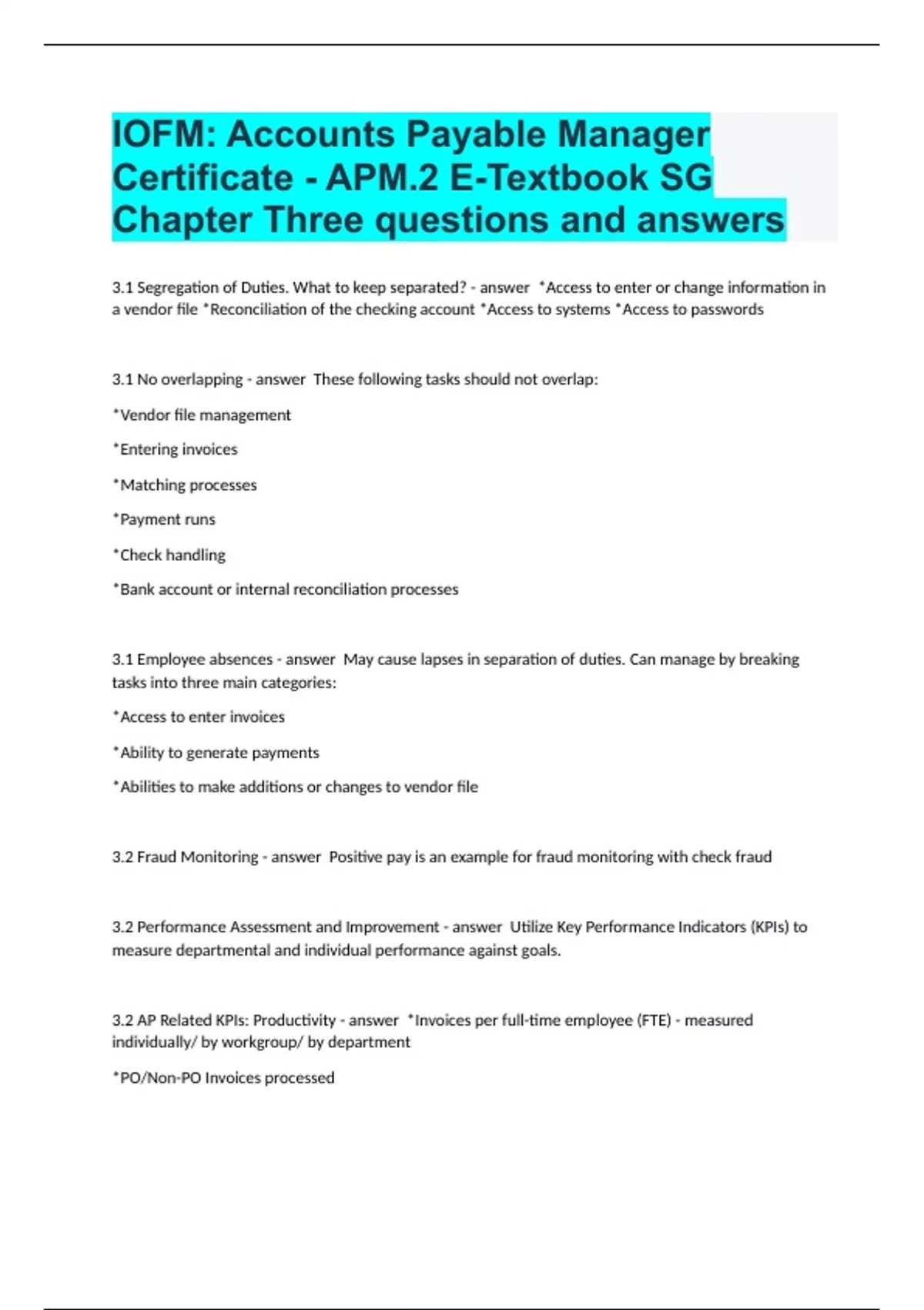 IOFM Accounts Payable Manager Certificate - APM.2 E-Textbook SG Chapter Three questions and