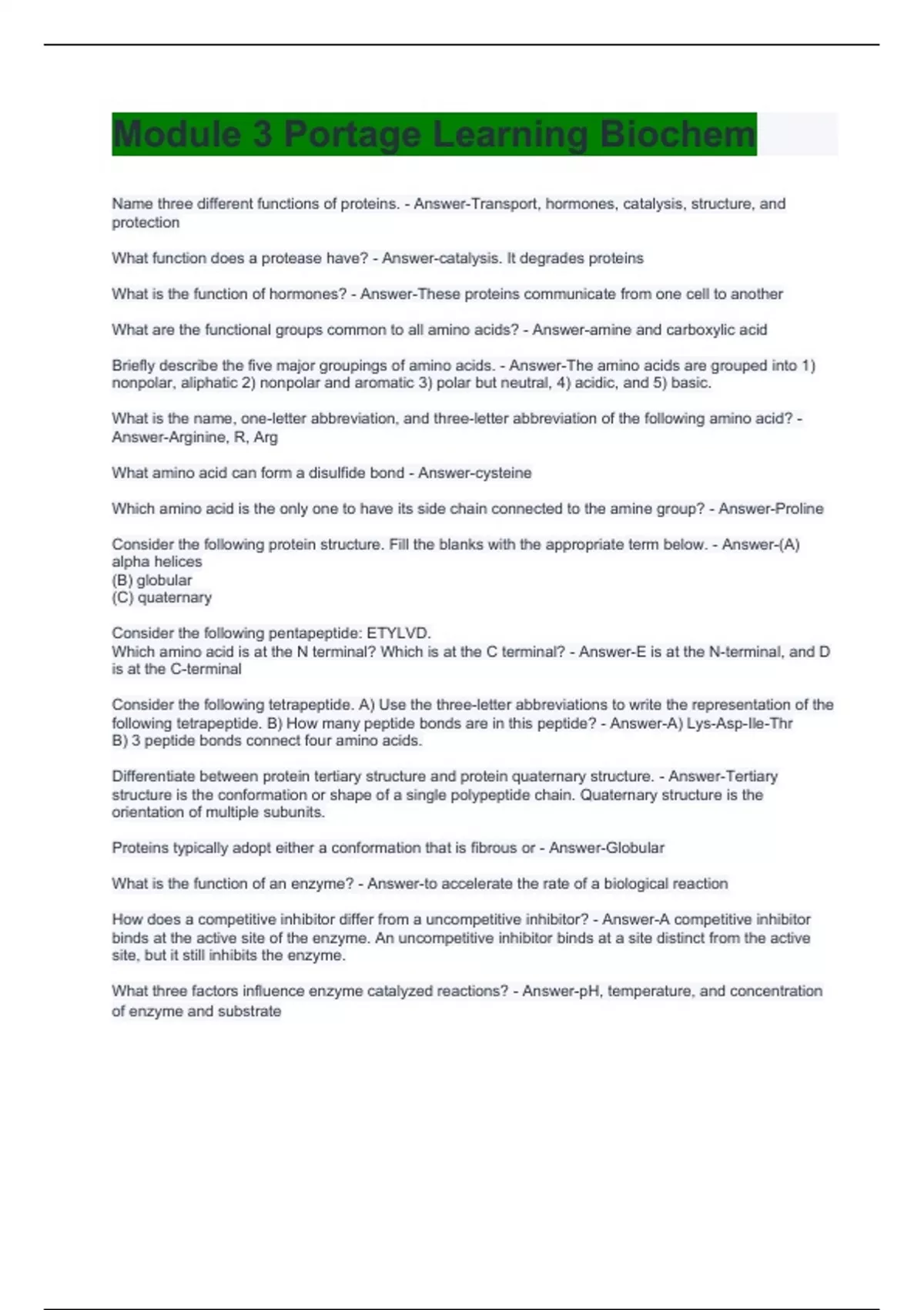 Module 3 Portage Learning Biochem Name three different functions of proteins. - Answer-Transport, hormones, catalysis, structure, and protection What function does a protease have? - Answer-catalysis. It degrades proteins What is the function of hormones? - Answer-These proteins communicate from one cell to another What are the functional groups common to all amino acids? - Answer-amine and carboxylic acid Briefly describe the five major groupings of amino acids. - Answer-The amino acids are grouped into 1) nonpolar, aliphatic 2) nonpolar and aromatic 3) polar but neutral, 4) acidic, and 5) basic. What is the name, one-letter abbreviation, and three-letter abbreviation of the following amino acid? - Answer-Arginine, R, Arg What amino acid can form a disulfide bond - Answer-cysteine Which amino acid is the only one to have its side chain connected to the amine group? - Answer-Proline Consider the following protein structure. Fill the blanks with the appropriate term below. - Answer-(A) alpha helices (B) globular (C) quaternary Consider the following pentapeptide: ETYLVD. Which amino acid is at the N terminal? Which is at the C terminal? - Answer-E is at the N-terminal, and D is at the C-terminal Consider the following tetrapeptide. A) Use the three-letter abbreviations to write the representation of the following tetrapeptide. B) How many peptide bonds are in this peptide? - Answer-A) Lys-Asp-Ile-Thr B) 3 peptide bonds connect four amino acids. Differentiate between protein tertiary structure and protein quaternary structure. - Answer-Tertiary structure is the conformation or shape of a single polypeptide chain. Quaternary structure is the orientation of multiple subunits. Proteins typically adopt either a conformation that is fibrous or - Answer-Globular What is the function of an enzyme? - Answer-to accelerate the rate of a biological reaction How does a competitive inhibitor differ from a uncompetitive inhibitor? - Answer-A competitive inhibitor binds at the active site of the enzyme. An uncompetitive inhibitor binds at a site distinct from the active site, but it still inhibits the enzyme. What three factors influence enzyme catalyzed reactions? - Answer-pH, temperature, and concentration of enzyme and substrate