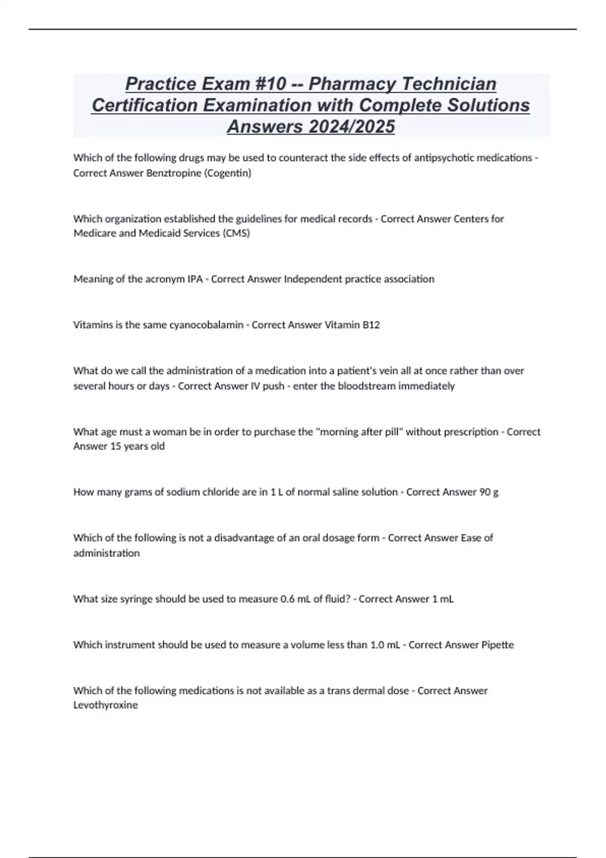 Practice Exam #10 -- Pharmacy Technician Certification Examination with Complete Solutions Answers 2024/2025 Which of the following drugs may be used to counteract the side effects of antipsychotic medications - Correct Answer Benztropine (Cogentin) Which organization established the guidelines for medical records - Correct Answer Centers for Medicare and Medicaid Services (CMS) Meaning of the acronym IPA - Correct Answer Independent practice association Vitamins is the same cyanocobalamin - Correct Answer Vitamin B12 What do we call the administration of a medication into a patient's vein all at once rather than over several hours or days - Correct Answer IV push - enter the bloodstream immediately What age must a woman be in order to purchase the "morning after pill" without prescription - Correct Answer 15 years old How many grams of sodium chloride are in 1 L of normal saline solution - Correct Answer 90 g Which of the following is not a disadvantage of an oral dosage form - Correct Answer Ease of administration What size syringe should be used to measure 0.6 mL of fluid? - Correct Answer 1 mL Which instrument should be used to measure a volume less than 1.0 mL - Correct Answer Pipette Which of the following medications is not available as a trans dermal dose - Correct Answer Levothyroxine