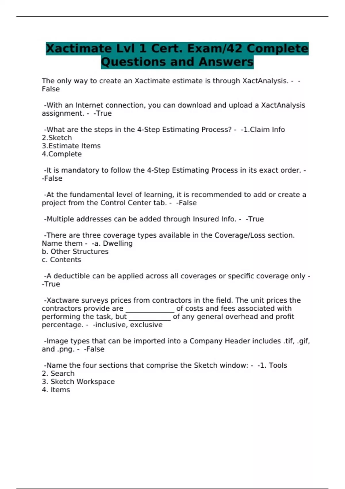 Xactimate Lvl 1 Cert. Exam/42 Complete