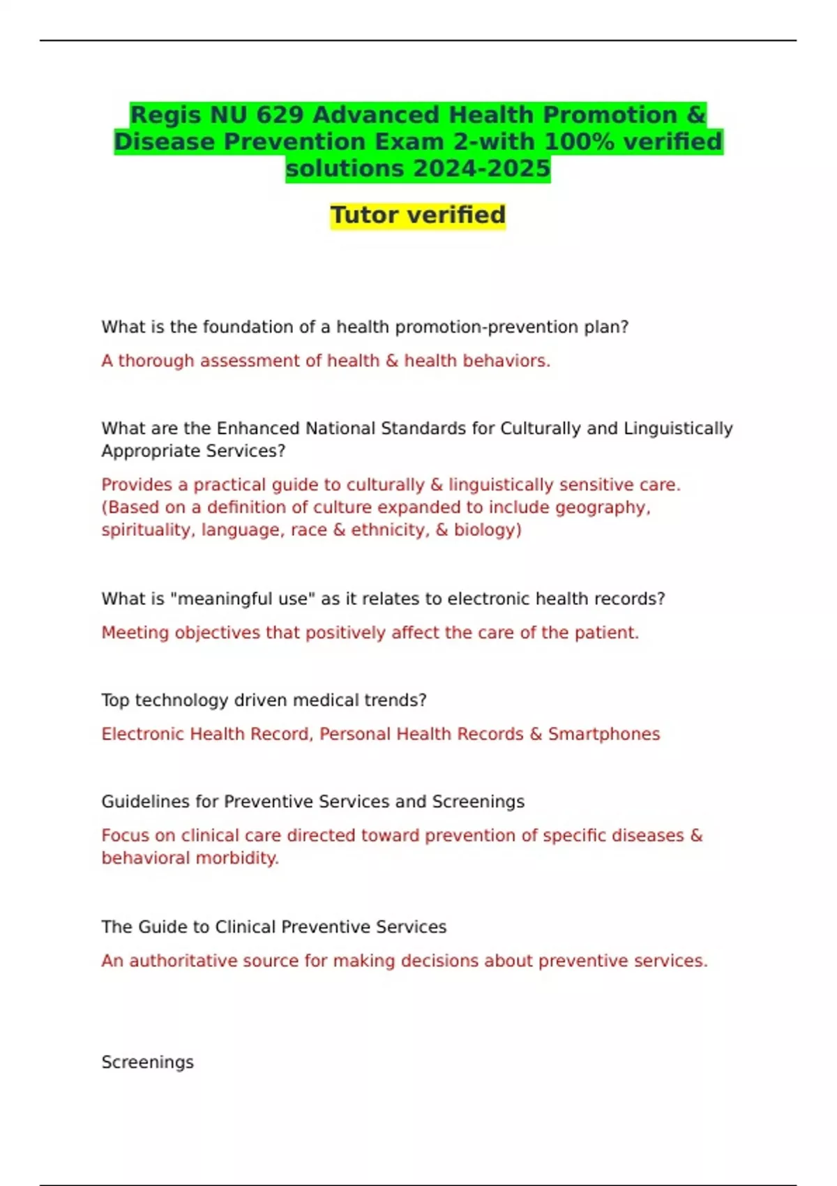 Regis NU 629 Advanced Health Promotion & Disease Prevention Exam 2-with 100% verified solutions