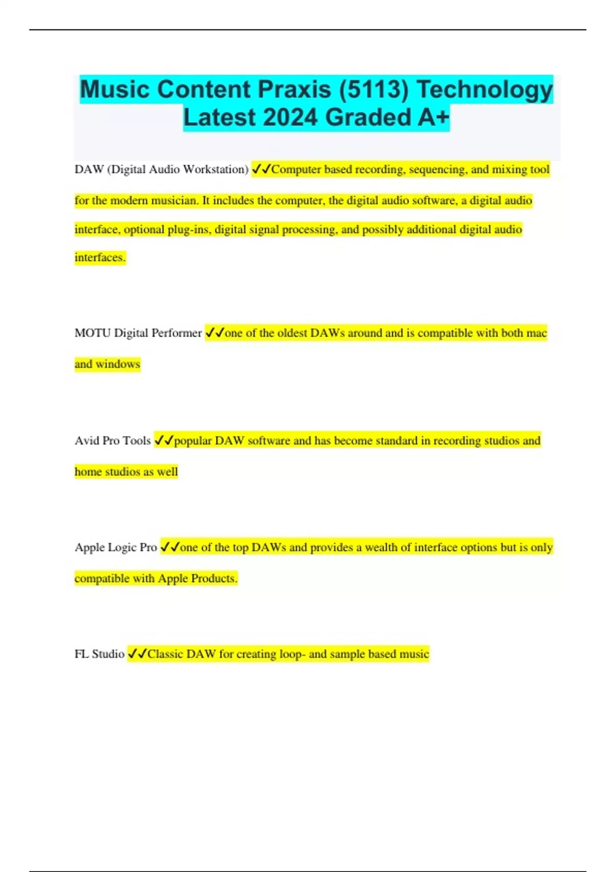 Music Content Praxis (5113) Technology Latest 2024 Graded A+