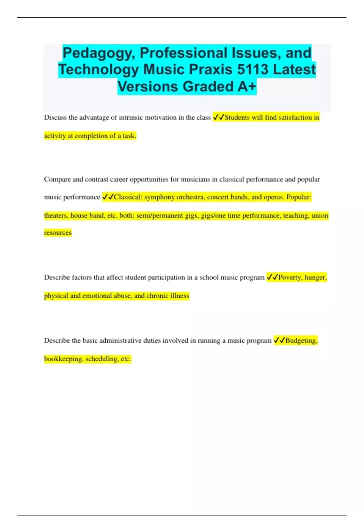 Pedagogy, Professional Issues, and Technology Music Praxis 5113 Latest Versions Graded A+ Discuss the advantage of intrinsic motivation in the class Students will find satisfaction in activity at completion of a task. Compare and contrast career opportunities for musicians in classical performance and popular music performance Classical: symphony orchestra, concert bands, and operas. Popular: theaters, house band, etc. both: semi/permanent gigs, gigs/one time performance, teaching, union resources Describe factors that affect student participation in a school music program Poverty, hunger, physical and emotional abuse, and chronic illness Describe the basic administrative duties involved in running a music program Budgeting, bookkeeping, scheduling, etc. Discuss techniques for meaningful parent-teacher conferences emphasizing two-way communication Providing opportunities for dialogue, flexibility, and an open and receptive attitude Discuss the practical advantages of collaborating with colleagues in terms of implementing a music curriculum Learning from other's experiences, connecting with other subjects, and collaborating with librarians. Describe the utilitarian approach to the philosophy of music education Good character, civic responsibility, cultural awareness, and quality of nobility Describe the various job opportunities within Music technology and knowledge and skills needed Audio equipment technicians, sound engineers, recording engineers Internet publishing, multimedia production, music software design, music hardware design, cd audio production, sound design, computer-based education and training, and music publishing Describe the career opportunities in performing arts medicine Physical therapy, occupational therapy, speech therapy, psychological services, or other forms of arts special-specific rehabilitation Describe the knowledge and skills needed to become a music therapist Studying music, psychology, the biological social, behavioral sciences, and disabilities. They also need to assist client needs, develop and implement treatment plans, and evaluate and document clinical changes with strong communication and interpersonal skills. Describe the preparatory education and training necessary for a career in music business, and list example job titles Music business major, artist manager, booking agent, business manager, recording studio owner, music publisher, Internet marketing specialist, media promotion specialist, concert or event promoter, arts and entertainment writer, publicist, production manager, recording studio manager, artist and repertoire scout, account executive, finance assistant, artist liaison, tour manager, booking agent, independent radio promoter, and music listening supervisor. Describe the preparatory education and training necessary for a career in music education A minimum of a bachelors degree in music education, with the proper state teaching certification. To teach in a college, conservatory, or University settings, the person should aim for a doctorate or terminal degree. Describe the Suzuki Method and its impact on modern music education Mother tongue approach, gain instrument competence, then learn to read notation. Summarize the music philosophy of Bennett Reimer Merit of music: connecting people to feelings, performance should not be focused, aesthetic philosophy. Describe the aesthetic approach to the philosophy of music education Scholars argued that many ought to be studied in and for itself; only through music and the arts can students develop the sensitivity, feeling, and symbolic communication represented by musical understanding Describe the benefit of getting involved in IEP's
