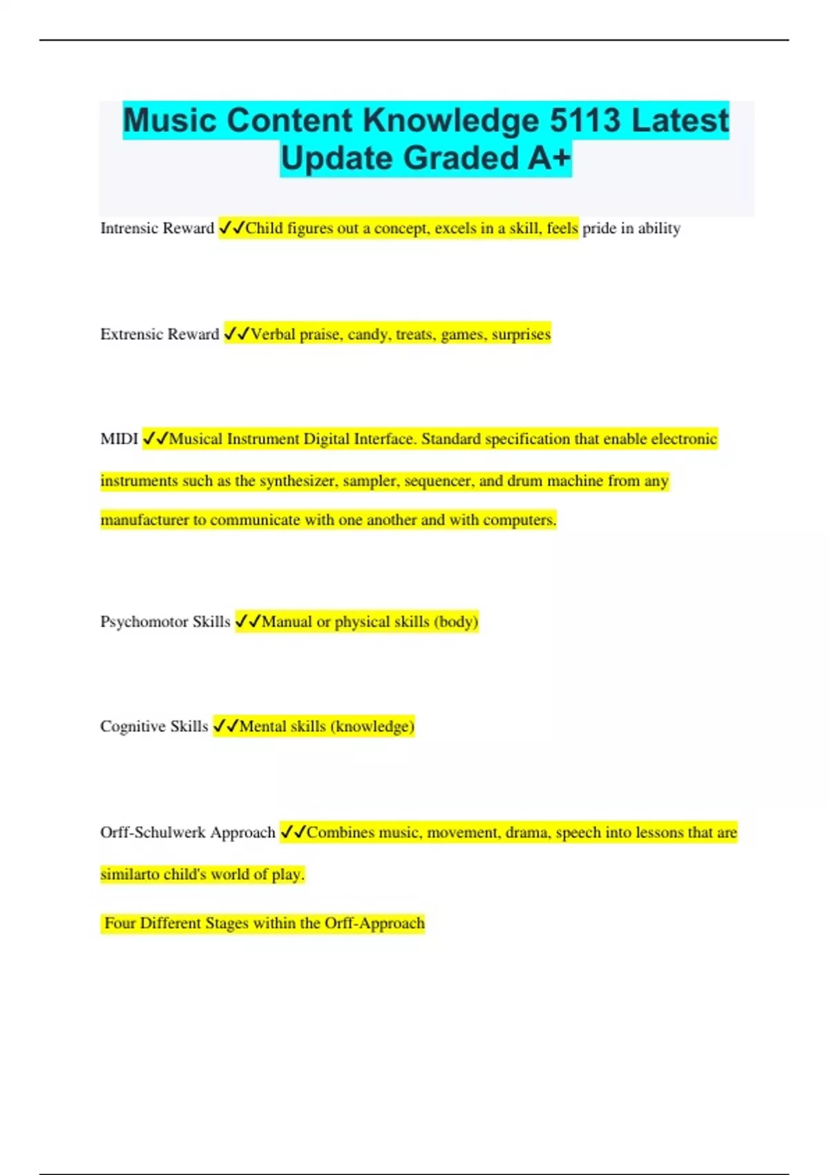 Music Content Knowledge 5113 Latest Update Graded A+ Intrensic Reward Child figures out a concept, excels in a skill, feels pride in ability Extrensic Reward Verbal praise, candy, treats, games, surprises MIDI Musical Instrument Digital Interface. Standard specification that enable electronic instruments such as the synthesizer, sampler, sequencer, and drum machine from any manufacturer to communicate with one another and with computers. Psychomotor Skills Manual or physical skills (body) Cognitive Skills Mental skills (knowledge) Orff-Schulwerk Approach Combines music, movement, drama, speech into lessons that are similarto child's world of play. Four Different Stages within the Orff-Approach 1. Imitation - the teacher, group leader, or students perform for the class and the class in turn repeats what was played for them. 2. Exploration - Allows students to seek out not only the different musical aspects that the Orff instruments offer but they also explore aural/oral skills and the different motions and expressions that the body is capable of 3. Literacy - Taught by learning musical notation and becoming familiar with the various forms of music like rondo, and ABA 4. Improvisation - The act of creating something, especially music, without prior preparation. Kodaly Method Child-developmental approach, sequence, introducing skills in accordance with the capabilities of the child. Rhythm syllables (Quarter note = ta), (Eighth note pairs = ti-ti), (Half note = Ta-a) Moveable-do solfege and hand signs Dalcroze "Rhythmic gymnastics," eurythmic teaches concepts of rhythm, structure, and musical expression using movement. Suzuki Includes love, high-quality, praise, rote-training, repetition, and a time-table set by the student's developmental readiness for learning a particular technique. Which of the following lists the musical genres in the correct chronological order of their development? A. Motet, string quartet, opera, symphonic poem B. Motet, opera, string quartet, symphonic poem C. Opera, motet, string quartet, symphonic poem D. Opera, symphonic poem, motet, string quartet B. motet - 13th century opera - 17th century string quartet - 18th century symphonic poem - 19th century Creating an ostinato on barred instruments to accompany a folk song is most closely associated with which of the following approaches? A. Orff B. Kodaly C. Dalcroze C. Gordon A. Orff The singing of folk songs accompanied by improvised ostinatos on barred instruments is an important component of the curricular approach developed by Carl Orff. C. making an arrangement of a copyrighted work for a school ensemble to perform Under current U.S. copyright law, guidelines for educational uses ("fair use") of music permit all of the following EXCEPT A. emergency copying to replace purchased copy that is lost and is not available for an imminent performance B. making a single copy of recordings of performances for evaluating rehearsal purposes C. making an arrangement of a copyrighted work for a school ensemble to perform D. copying for the purpose of scholarly research Which of the following ballets was written by Copland?