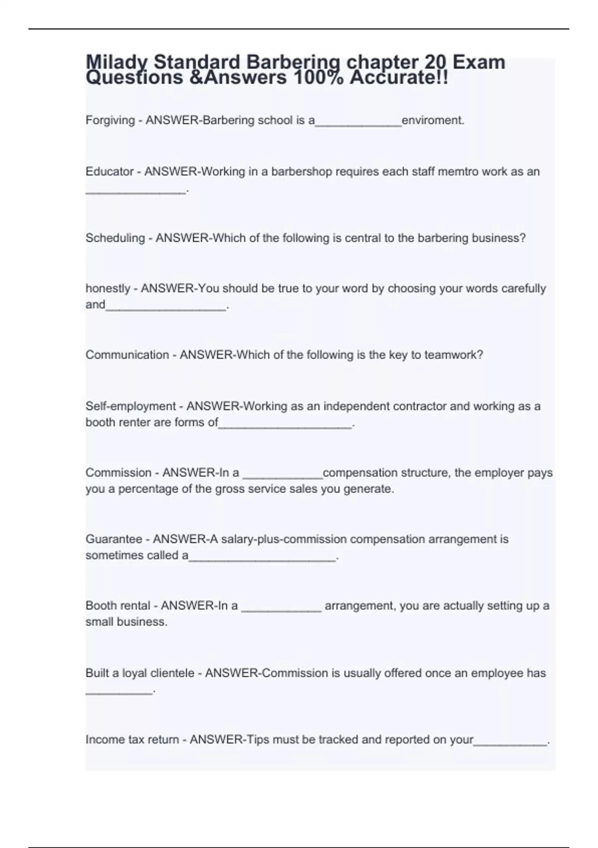 Forgiving - ANSWER-Barbering school is a_____________enviroment. Educator - ANSWER-Working in a barbershop requires each staff memtro work as an _______________. Scheduling - ANSWER-Which of the following is central to the barbering business? honestly - ANSWER-You should be true to your word by choosing your words carefully and__________________. Communication - ANSWER-Which of the following is the key to teamwork? Self-employment - ANSWER-Working as an independent contractor and working as a booth renter are forms of____________________. Commission - ANSWER-In a ____________compensation structure, the employer pays you a percentage of the gross service sales you generate. Guarantee - ANSWER-A salary-plus-commission compensation arrangement is sometimes called a______________________. Booth rental - ANSWER-In a ____________ arrangement, you are actually setting up a small business. Built a loyal clientele - ANSWER-Commission is usually offered once an employee has __________. Income tax return - ANSWER-Tips must be tracked and reported on your___________.