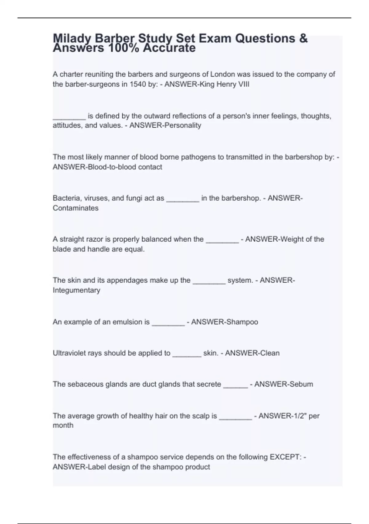 A charter reuniting the barbers and surgeons of London was issued to the company of the barber-surgeons in 1540 by: - ANSWER-King Henry VIII ________ is defined by the outward reflections of a person's inner feelings, thoughts, attitudes, and values. - ANSWER-Personality The most likely manner of blood borne pathogens to transmitted in the barbershop by: - ANSWER-Blood-to-blood contact Bacteria, viruses, and fungi act as ________ in the barbershop. - ANSWER-Contaminates A straight razor is properly balanced when the ________ - ANSWER-Weight of the blade and handle are equal. The skin and its appendages make up the ________ system. - ANSWER-Integumentary An example of an emulsion is ________ - ANSWER-Shampoo Ultraviolet rays should be applied to _______ skin. - ANSWER-Clean The sebaceous glands are duct glands that secrete ______ - ANSWER-Sebum The average growth of healthy hair on the scalp is ________ - ANSWER-1/2" per month