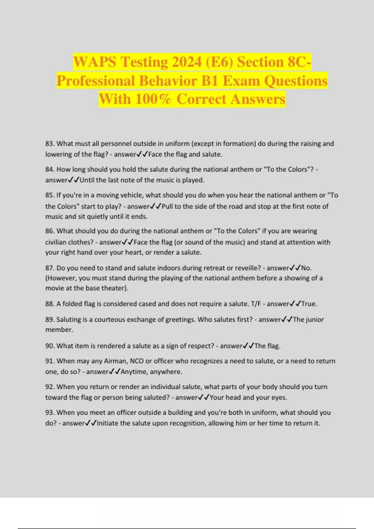 WAPS Testing 2024 (E6) Section 8C- Professional Behavior B1 Exam Questions With 100% Correct Answers 83. What must all personnel outside in uniform (except in formation) do during the raising and lowering of the flag? - answerFace the flag and salute. 84. How long should you hold the salute during the national anthem or "To the Colors"? - answerUntil the last note of the music is played. 85. If you're in a moving vehicle, what should you do when you hear the national anthem or "To the Colors" start to play? - answerPull to the side of the road and stop at the first note of music and sit quietly until it ends. 86. What should you do during the national anthem or "To the Colors" if you are wearing civilian clothes? - answerFace the flag (or sound of the music) and stand at attention with your right hand over your heart, or render a salute. 87. Do you need to stand and salute indoors during retreat or reveille? - answerNo. (However, you must stand during the playing of the national anthem before a showing of a movie at the base theater). 88. A folded flag is considered cased and does not require a salute. T/F - answerTrue. 89. Saluting is a courteous exchange of greetings. Who salutes first? - answerThe junior member. 90. What item is rendered a salute as a sign of respect? - answerThe flag. 91. When may any Airman, NCO or officer who recognizes a need to salute, or a need to return one, do so? - answerAnytime, anywhere. 92. When you return or render an individual salute, what parts of your body should you turn toward the flag or person being saluted? - answerYour head and your eyes. 93. When you meet an officer outside a building and you're both in uniform, what should you do? - answerInitiate the salute upon recognition, allowing him or her time to return it.
