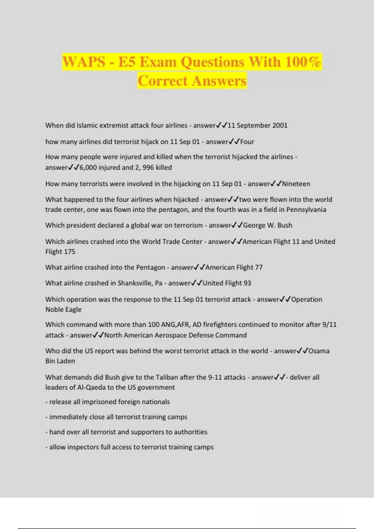 WAPS - E5 Exam Questions With 100% Correct Answers When did Islamic extremist attack four airlines - answer11 September 2001 how many airlines did terrorist hijack on 11 Sep 01 - answerFour How many people were injured and killed when the terrorist hijacked the airlines - answer6,000 injured and 2, 996 killed How many terrorists were involved in the hijacking on 11 Sep 01 - answerNineteen What happened to the four airlines when hijacked - answertwo were flown into the world trade center, one was flown into the pentagon, and the fourth was in a field in Pennsylvania Which president declared a global war on terrorism - answerGeorge W. Bush Which airlines crashed into the World Trade Center - answerAmerican Flight 11 and United Flight 175 What airline crashed into the Pentagon - answerAmerican Flight 77 What airline crashed in Shanksville, Pa - answerUnited Flight 93 Which operation was the response to the 11 Sep 01 terrorist attack - answerOperation Noble Eagle Which command with more than 100 ANG,AFR, AD firefighters continued to monitor after 9/11 attack - answerNorth American Aerospace Defense Command Who did the US report was behind the worst terrorist attack in the world - answerOsama Bin Laden What demands did Bush give to the Taliban after the 9-11 attacks - answer- deliver all leaders of Al-Qaeda to the US government - release all imprisoned foreign nationals - immediately close all terrorist training camps - hand over all terrorist and supporters to authorities - allow inspectors full access to terrorist training camps Which operation took the fight against terrorism to foreign soil - answerOperation Enduring Freedom Which operation was focused on forming and acting with an international coalition to remove Afgans taliban government - answerOperation Enduring Freedom How many aircrafts did the US send to afgan - answer350 Which bombers, fighters, and unmanned aerial vehicles deployed to bases in Afgan - answerB-1 and B-52 bombers F-15 and F-16 fighters RQ-1B and RQ-4A aerial vehicles On 7 Oct 01, which countries aircraft began a sustained air campaign against terrorist targets in Afgan - answerUS, British, and French Enduring Freedom strikes began with Air Force bombers, who directed attacks to engagement zones for the AF B-52 bombers - answerGround-based forces What enabled air planners to reduce, with great accuracy, the number of air sorties required to destroy particular objectives in Enduring Freedom - answerGuided munitions In the opening days of the campaign which targets did joint and combined efforts destroy - answerTaliban air defenses, command centers, and other fixed targets Combat operations in Afgan began with small groups of elite american military forces. Who were they deployed to support - answerAnti-taliban Afghani fighters What challenges did coalition forces during enduring freedom face throughout afghan - answerafghans rugged terrain complex political relationships distance from operating bases AF combat controllers were among the 300 army, navy, and AF special ops that augmented who - answerThe Afghan northern alliance When did coalition forces take control of Kabul - answerNovember 2001 What was the last major town under taliban control, in December 2001 it was abandoned - answerKandahar In enduring freedom when terrorist forces were run underground but not eliminated what did this cause - answerongoing, extended counterinsurgency operations