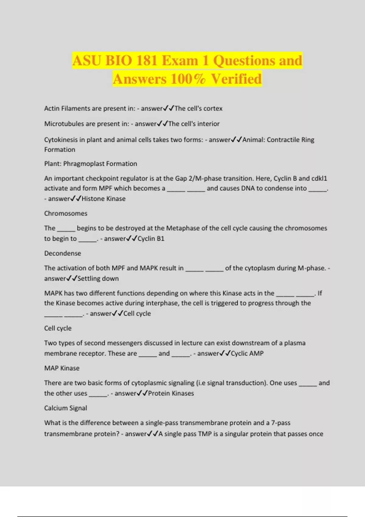 ASU BIO 181 Exam 1 Questions and Answers 100% Verified Actin Filaments are present in: - answerThe cell's cortex Microtubules are present in: - answerThe cell's interior Cytokinesis in plant and animal cells takes two forms: - answerAnimal: Contractile Ring Formation Plant: Phragmoplast Formation An important checkpoint regulator is at the Gap 2/M-phase transition. Here, Cyclin B and cdkl1 activate and form MPF which becomes a _____ _____ and causes DNA to condense into _____. - answerHistone Kinase Chromosomes The _____ begins to be destroyed at the Metaphase of the cell cycle causing the chromosomes to begin to _____. - answerCyclin B1 Decondense The activation of both MPF and MAPK result in _____ _____ of the cytoplasm during M-phase. - answerSettling down MAPK has two different functions depending on where this Kinase acts in the _____ _____. If the Kinase becomes active during interphase, the cell is triggered to progress through the _____ _____. - answerCell cycle Cell cycle Two types of second messengers discussed in lecture can exist downstream of a plasma membrane receptor. These are _____ and _____. - answerCyclic AMP MAP Kinase There are two basic forms of cytoplasmic signaling (i.e signal transduction). One uses _____ and the other uses _____. - answerProtein Kinases Calcium Signal What is the difference between a single-pass transmembrane protein and a 7-pass transmembrane protein? - answerA single pass TMP is a singular protein that passes once