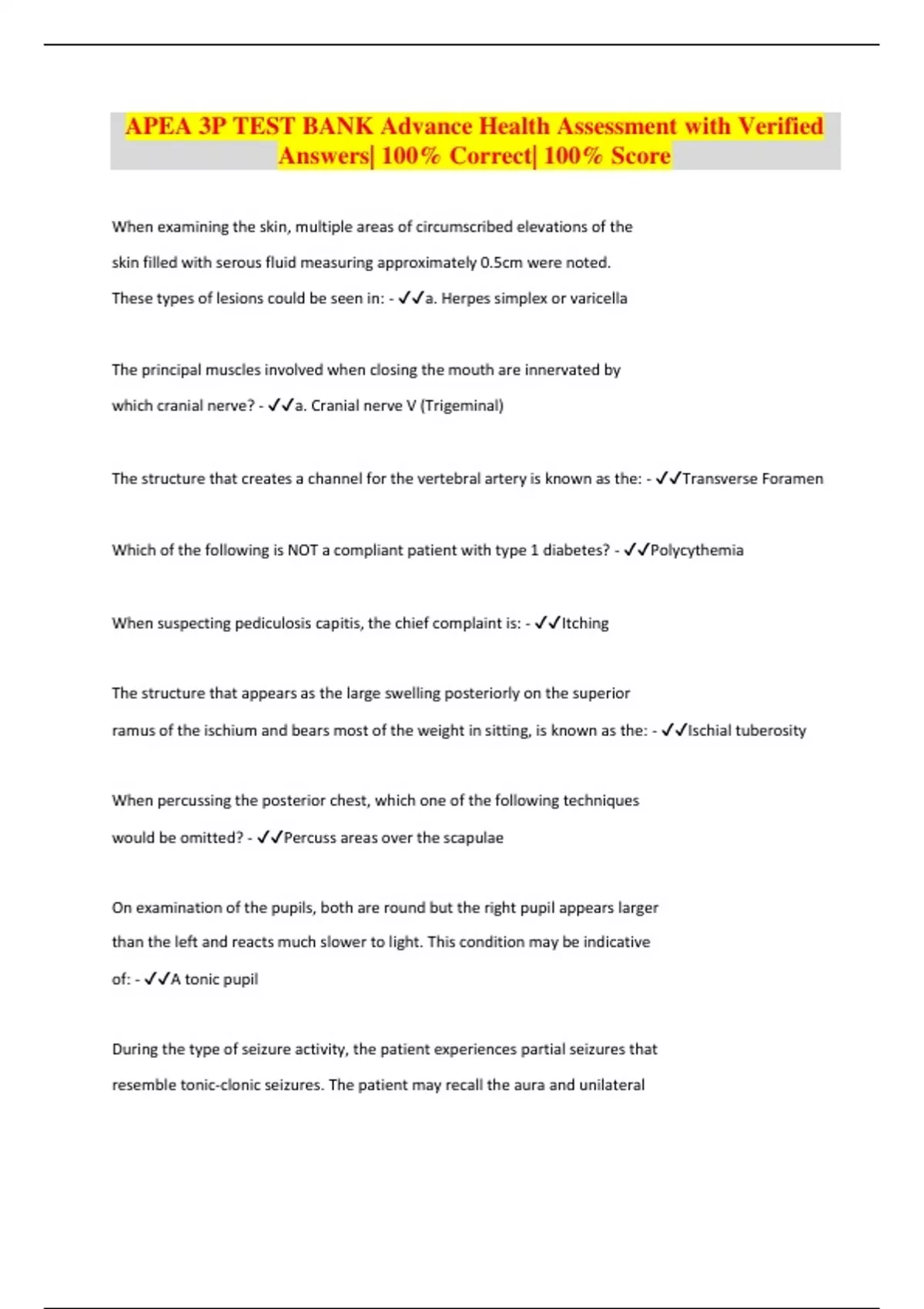 APEA 3P TEST BANK Advance Health Assessment with Verified Answers| 100% Correct| 100% Score When examining the skin, multiple areas of circumscribed elevations of the skin filled with serous fluid measuring approximately 0.5cm were noted. These types of lesions could be seen in: - a. Herpes simplex or varicella The principal muscles involved when closing the mouth are innervated by which cranial nerve? - a. Cranial nerve V (Trigeminal) The structure that creates a channel for the vertebral artery is known as the: - Transverse Foramen Which of the following is NOT a compliant patient with type 1 diabetes? - Polycythemia When suspecting pediculosis capitis, the chief complaint is: - Itching The structure that appears as the large swelling posteriorly on the superior ramus of the ischium and bears most of the weight in sitting, is known as the: - Ischial tuberosity When percussing the posterior chest, which one of the following techniques would be omitted? - Percuss areas over the scapulae On examination of the pupils, both are round but the right pupil appears larger than the left and reacts much slower to light. This condition may be indicative of: - A tonic pupil During the type of seizure activity, the patient experiences partial seizures that resemble tonic-clonic seizures. The patient may recall the aura and unilateral neurologic deficit is present during the postictal period. This type of seizure activity is referred to as a: - focal seizure that becomes generalized