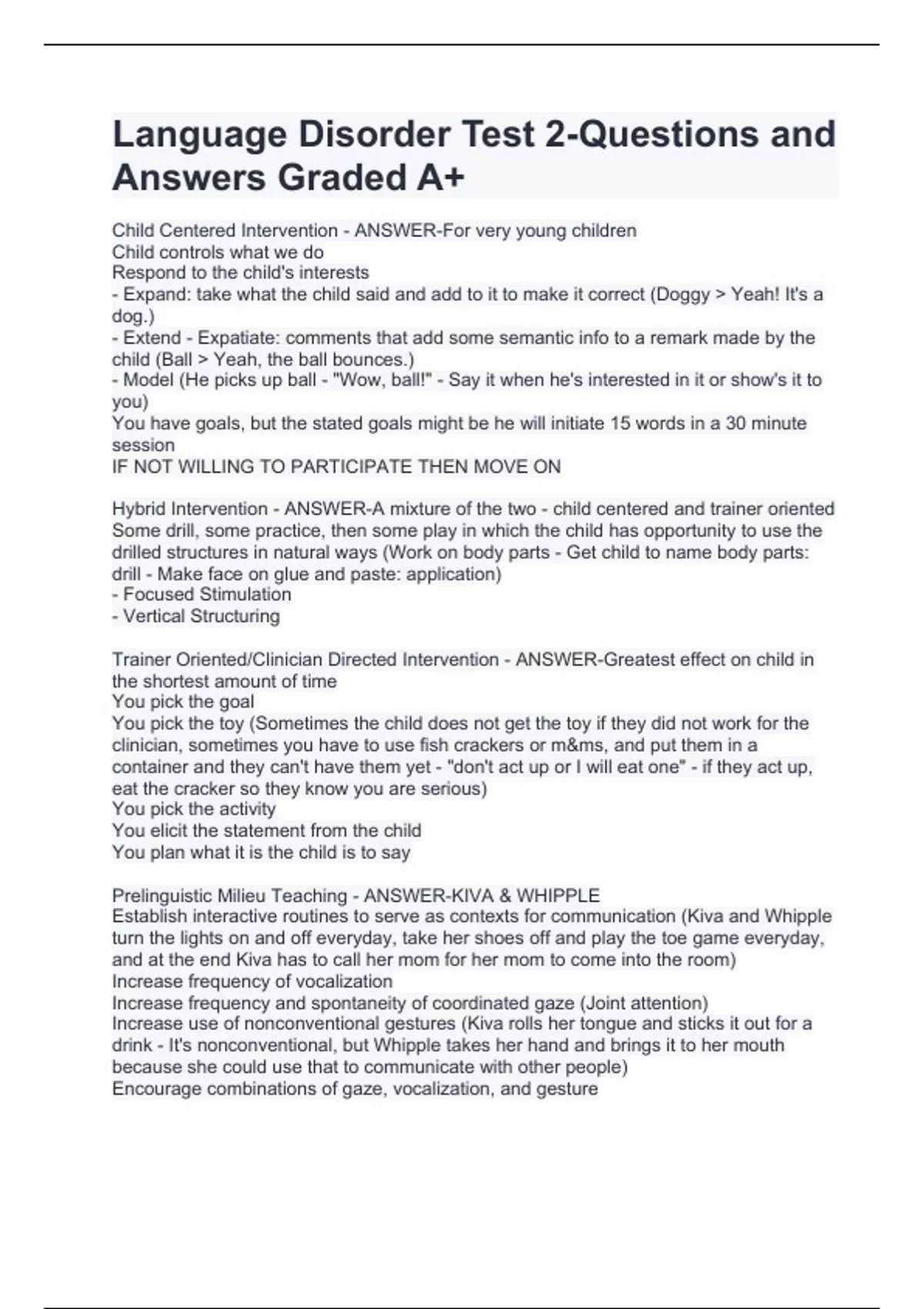 Language Disorder Test 2-Questions and Answers Graded A+ Child Centered Intervention - ANSWER-For very young children Child controls what we do Respond to the child's interests - Expand: take what the child said and add to it to make it correct (Doggy Yeah! It's a dog.) - Extend - Expatiate: comments that add some semantic info to a remark made by the child (Ball Yeah, the ball bounces.) - Model (He picks up ball - "Wow, ball!" - Say it when he's interested in it or show's it to you) You have goals, but the stated goals might be he will initiate 15 words in a 30 minute session IF NOT WILLING TO PARTICIPATE THEN MOVE ON Hybrid Intervention - ANSWER-A mixture of the two - child centered and trainer oriented Some drill, some practice, then some play in which the child has opportunity to use the drilled structures in natural ways (Work on body parts - Get child to name body parts: drill - Make face on glue and paste: application) - Focused Stimulation - Vertical Structuring Trainer Oriented/Clinician Directed Intervention - ANSWER-Greatest effect on child in the shortest amount of time You pick the goal You pick the toy (Sometimes the child does not get the toy if they did not work for the clinician, sometimes you have to use fish crackers or m&ms, and put them in a container and they can't have them yet - "don't act up or I will eat one" - if they act up, eat the cracker so they know you are serious) You pick the activity You elicit the statement from the child You plan what it is the child is to say Prelinguistic Milieu Teaching - ANSWER-KIVA & WHIPPLE Establish interactive routines to serve as contexts for communication (Kiva and Whipple turn the lights on and off everyday, take her shoes off and play the toe game everyday, and at the end Kiva has to call her mom for her mom to come into the room) Increase frequency of vocalization Increase frequency and spontaneity of coordinated gaze (Joint attention) Increase use of nonconventional gestures (Kiva rolls her tongue and sticks it out for a drink - It's nonconventional, but Whipple takes her hand and brings it to her mouth because she could use that to communicate with other people) Encourage combinations of gaze, vocalization, and gesture