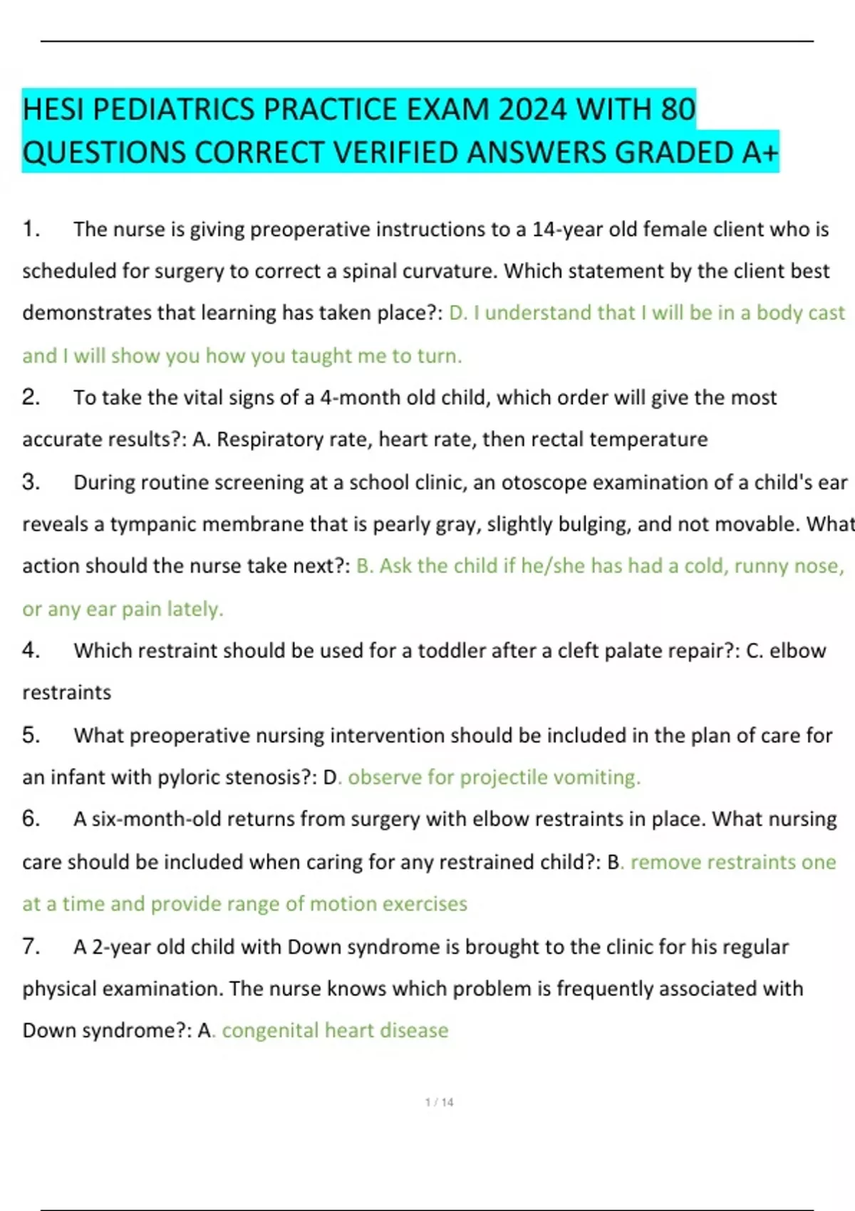 HESI PEDIATRICS PRACTICE EXAM 2024 WITH 80 QUESTIONS CORRECT VERIFIED ANSWERS GRADED A+ 1. The nurse is giving preoperative instructions to a 14-year old female client who is scheduled for surgery to correct a spinal curvature. Which statement by the client best demonstrates that learning has taken place?: D. I understand that I will be in a body cast and I will show you how you taught me to turn. 2. To take the vital signs of a 4-month old child, which order will give the most accurate results?: A. Respiratory rate, heart rate, then rectal temperature 3. During routine screening at a school clinic, an otoscope examination of a child's ear reveals a tympanic membrane that is pearly gray, slightly bulging, and not movable. What action should the nurse take next?: B. Ask the child if he/she has had a cold, runny nose, or any ear pain lately.