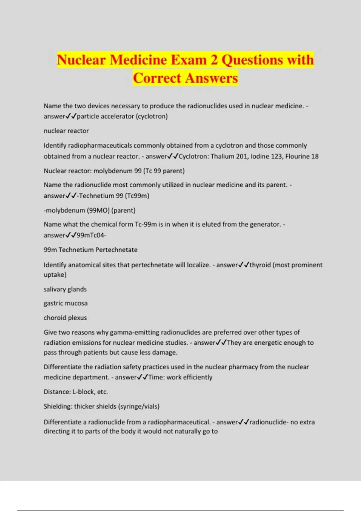 Nuclear Medicine Exam 2 Questions with Correct Answers Name the two devices necessary to produce the radionuclides used in nuclear medicine. - answerparticle accelerator (cyclotron) nuclear reactor Identify radiopharmaceuticals commonly obtained from a cyclotron and those commonly obtained from a nuclear reactor. - answerCyclotron: Thalium 201, Iodine 123, Flourine 18 Nuclear reactor: molybdenum 99 (Tc 99 parent) Name the radionuclide most commonly utilized in nuclear medicine and its parent. - answer-Technetium 99 (Tc99m) -molybdenum (99MO) (parent) Name what the chemical form Tc-99m is in when it is eluted from the generator. - answer99mTc04- 99m Technetium Pertechnetate Identify anatomical sites that pertechnetate will localize. - answerthyroid (most prominent uptake) salivary glands gastric mucosa choroid plexus Give two reasons why gamma-emitting radionuclides are preferred over other types of radiation emissions for nuclear medicine studies. - answerThey are energetic enough to pass through patients but cause less damage. Differentiate the radiation safety practices used in the nuclear pharmacy from the nuclear medicine department. - answerTime: work efficiently Distance: L-block, etc. Shielding: thicker shields (syringe/vials) Differentiate a radionuclide from a radiopharmaceutical. - answerradionuclide- no extra directing it to parts of the body it would not naturally go to Explain the general purpose of USP 797 guidelines. - answerguidelines for preparation of sterile drugs aseptic tech/sterility Identify the five items of information needed when a radiopharmaceutical dose is ordered from the nuclear pharmacy. - answerpatient name procedure radiopharmaceutical dosage amount time of administration Define the term interventional agent and explain how this dose differs from a radiopharmaceutical. - answer-adjunctive meds -pharmaceuticals -not radioactive -administrate prior to or during scan -provoke physic response -challenge patients physiology Identify the two radiopharmaceuticals utilized in bone imaging. - answer-99mTc MDP (methyiene diphosphohate) -99mTc HDP (oxidronate) Identify the route of radiopharmaceutical administration and its excretory pathway from the body. - answerroute- IV injection excretory pathway- urine Identify the typical waiting time between radiopharmaceutical injection and when imaging begins. - answer2-3 hour waiting time Explain the different acquisition types used for bone imaging. - answerdynamic- blood flow static- 5-10 minute picture whole body- all bones SPECT- to see deeper within bone area