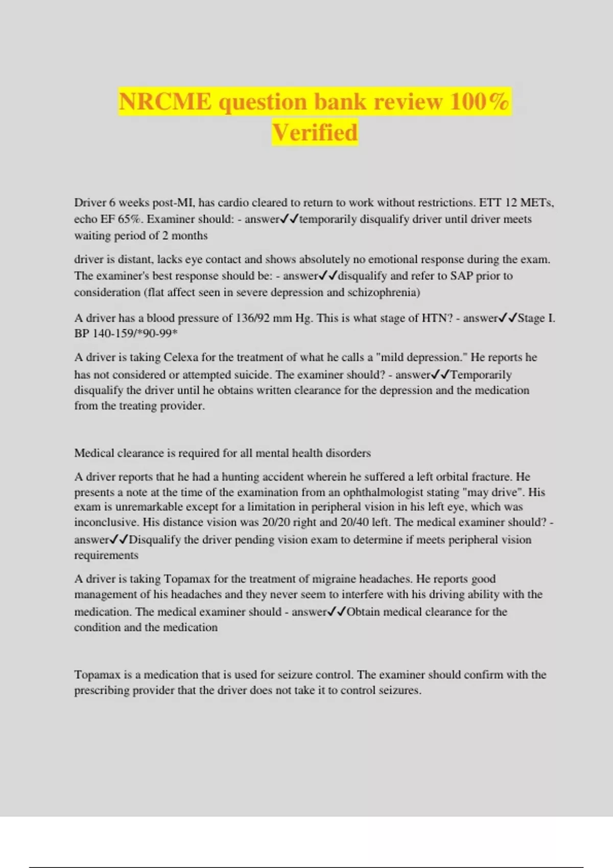 NRCME question bank review 100% Verified Driver 6 weeks post-MI, has cardio cleared to return to work without restrictions. ETT 12 METs, echo EF 65%. Examiner should: - answertemporarily disqualify driver until driver meets waiting period of 2 months driver is distant, lacks eye contact and shows absolutely no emotional response during the exam. The examiner's best response should be: - answerdisqualify and refer to SAP prior to consideration (flat affect seen in severe depression and schizophrenia) A driver has a blood pressure of 136/92 mm Hg. This is what stage of HTN? - answerStage I. BP 140-159/*90-99* A driver is taking Celexa for the treatment of what he calls a "mild depression." He reports he has not considered or attempted suicide. The examiner should? - answerTemporarily disqualify the driver until he obtains written clearance for the depression and the medication from the treating provider. Medical clearance is required for all mental health disorders A driver reports that he had a hunting accident wherein he suffered a left orbital fracture. He presents a note at the time of the examination from an ophthalmologist stating "may drive". His exam is unremarkable except for a limitation in peripheral vision in his left eye, which was inconclusive. His distance vision was 20/20 right and 20/40 left. The medical examiner should? - answerDisqualify the driver pending vision exam to determine if meets peripheral vision requirements A driver is taking Topamax for the treatment of migraine headaches. He reports good management of his headaches and they never seem to interfere with his driving ability with the medication. The medical examiner should - answerObtain medical clearance for the condition and the medication Topamax is a medication that is used for seizure control. The examiner should confirm with the prescribing provider that the driver does not take it to control seizures. Positive Babinski"reflex indicates what? What is examiner's next step? - answerindicative of abnormalities in the motor control pathways leading from the cerebral cortex; obtain clearance from a neurologist prior to reconsidering the driver for certification Epilepsy 14 years ago but stopped taking antiepileptic medication on his own 11 years ago. Has not seen a neurologist nor a health care provider in over 10 years and reports no seizures during this period. The examiner should: - answerDisqualify driver. Even though the driver reports exceeding the 10-year waiting period, it was not under medical supervision and the driver discontinued medication use and treatment outside of medical oversight. Waiting period following MI - answer2 months Waiting period following CABG - answer3 months The driver uses hearing aids during the whisper test. He is able to hear at 5 feet on the right and 4 feet on the left. Certification or no? - answerCertify x 2 yrs. The driver is able to use hearing aids during the whisper test (and this should be marked on the form). A driver must only qualify in 1 ear to certify. Moderate TBI that occurred 3 years ago. neurologist confirmed no seizures and cleared driver. Examiner should - answercertify x 1 yr waiting period is 2 years, max cert for mod TBI without seizure is 1 yr. Waiting period and max cert in driver with depression with suicide attempt 10 months ago. Reports feeling fine now and compliant with meds. Examiner should - answerDisqualify. Waiting period is 1 yr, max cert 1 yr history a back injury that had occurred 4 years earlier. He states that he was out of work following back surgery for over a year, but since has returned to driving and his last certification was good for 2 years. He lists as his only medication Oxycodone, which he takes only as needed. He reports seeing his "pain doctor" every few months for evaluation. He also reports he has had a steroid injection (series of 3) about a year ago, which "helped a lot." The examiner should: - answerRequest medical clearance. waiting period for ECT - answer6 months; maintenance ECT is disqualifying SPE for below knee amputation, max cert for? - answer2 yrs MI 6 months ago. How often for recertification? How often for ETT for monitoring? - answerAnnual recert; ETT every 2 years