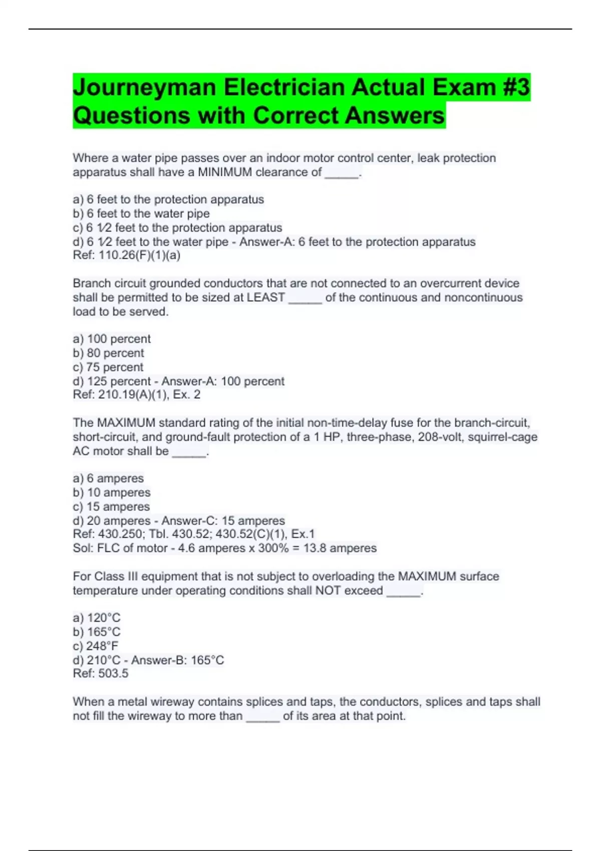 Journeyman Electrician Actual Exam #3 Questions with Correct Answers All wiring installed in or under an aircraft hanger floor shall comply with the requirements for _____ locations. a) Class I, Division 1 b) Class I, Division 2 c) Class II, Division 1 d) Class II, Division 2 - Answer-A: Class I, Division 1 Ref: 513.8(A) In general, branch-circuit conductors supplying more than one motor shall have an ampacity of at least _____ percent of the FLC of the largest motor, and 100 percent of the FLC of the other motor(s) in the group. a) 25 b) 80 c) 100 d) 125 - Answer-D: 125 Ref: 430.24 What is the MINIMUM size equipment grounding conductor required for a 5 HP, three-phase, 208-volt motor having 20- ampere rated overload protection and short-circuit overcurrent protection rated at 30 amperes? a) 10 AWG b) 14 AWG c) 12 AWG d) 8 AWG - Answer-A: 10 AWG Ref: Tbl. 250.122 If a circuit breaker serves as the controller for a motor, and the motor is not in sight of the breaker, the NEC requires which of the following? a) The motor to be less than 2 HP b) The breaker be able to be locked in the open position. c) The motor to be Code letter E d) The breaker to be rated 25,000 AIC. - Answer-B: The breaker be able to be locked in the open position. Ref: 430.102(B)(2), Ex. In Class II, Division 1, hazardous locations, an approved method of connection of conduit to boxes is _____. a) compression fittings b) threaded bosses c) welding d) all of these - Answer-B: threaded bosses Ref: 502.10(A)(4) Given: an AC service is supplied with four parallel sets of size 500 kcmil aluminum conductors. What is the MINIMUM size copper grounding electrode required, when connected to the concrete-encased building steel used as the grounding electrode system?