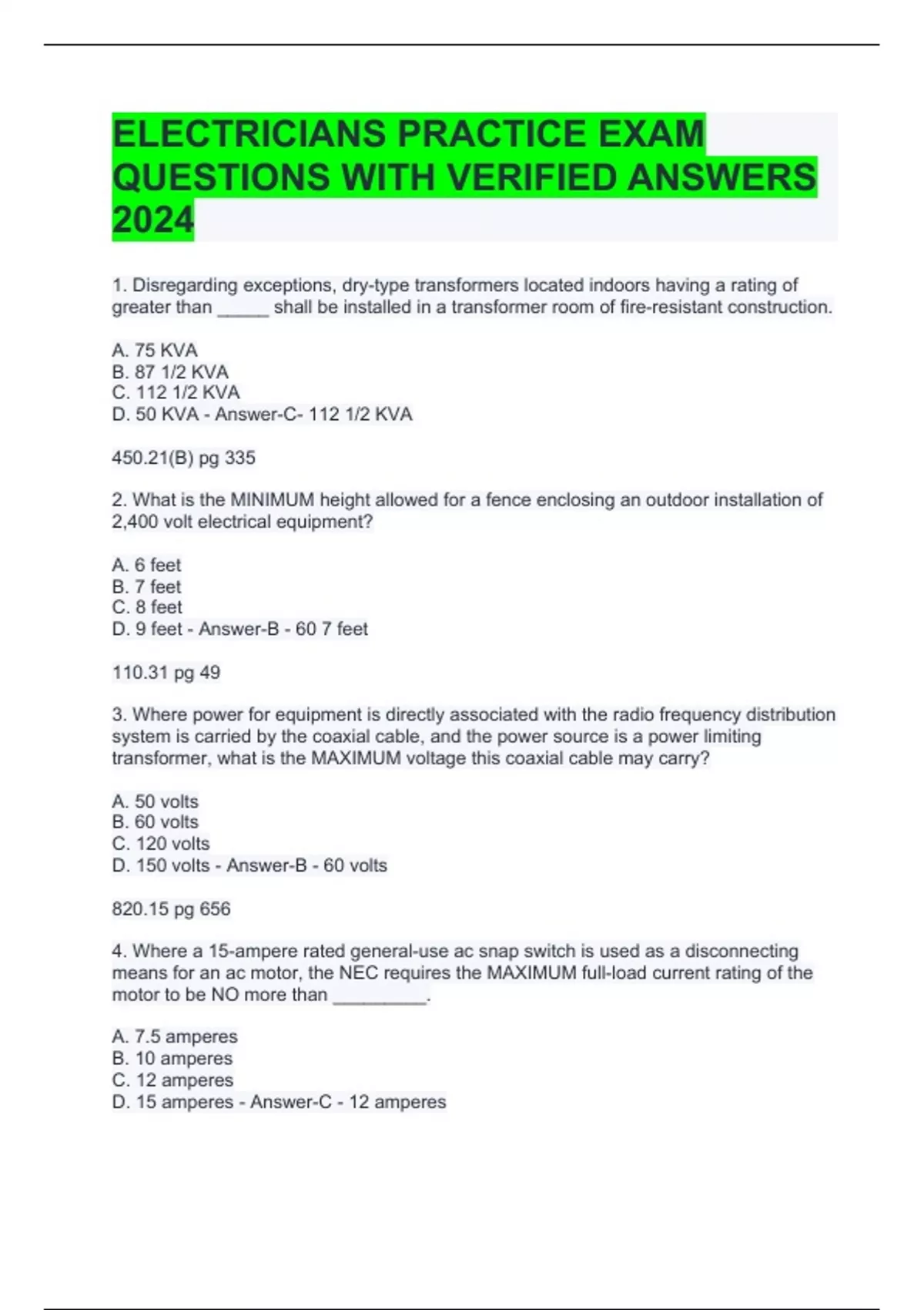 ELECTRICIANS PRACTICE EXAM QUESTIONS WITH VERIFIED ANSWERS 2024 12. A distance of NOT less than _____ in any direction shall be maintained between portable carnival or circus structures and overhead conductors operating at 600 volts or less, except for the conductors supplying the protable structure. A. 20 feet B. 10 feet C. 12 1/2 feet D. 15 feet - Answer-D 15 feet 525.5(B)(1) pg 445 13. Which of the following listed conductor insulations is oil resistant? A. TW B. TFE C. THWN D. MTW - Answer-D MTW Table 310.104(A) pg 166 14. All exposed non-current-carrying metal parts of an information technology system shall _____ or shall be double insulated. A. be bonded to the equipment grounding conductor B. not be bonded to the equipment grounding conductor C. be bonded to the grounded conductor D. be isolated - Answer-A be bonded to the equipment grounding conductor 645.15 pg 528 15. Determine the MINIMUM number of 15 ampere, 120-volt general lighting branch circuits required for a 12,000 square feet multifamily condo where each dwelling unit has cooking facilities provided. A. 15 B. 20 C. 24 D. 30 - Answer-B 20 Table 220.12 pg 71 12,000 sq. feet x 3 VA = 36,000 VA (building) 120 volts x 15 amps = 1,800 VA (1 circuit) 36,000 VA (building) = 20 circuits 1,800 VA (1 circuit)