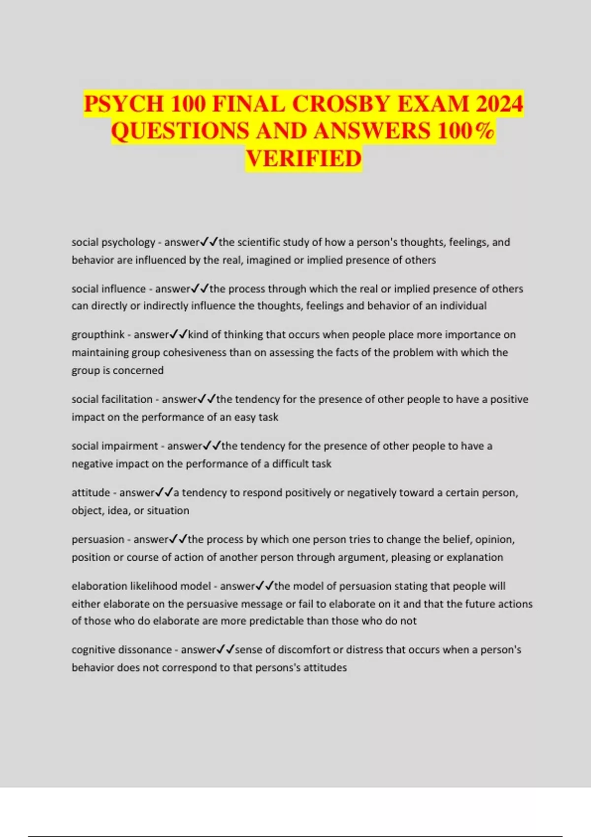 PSYCH 100 FINAL CROSBY EXAM 2024 QUESTIONS AND ANSWERS 100% VERIFIED
