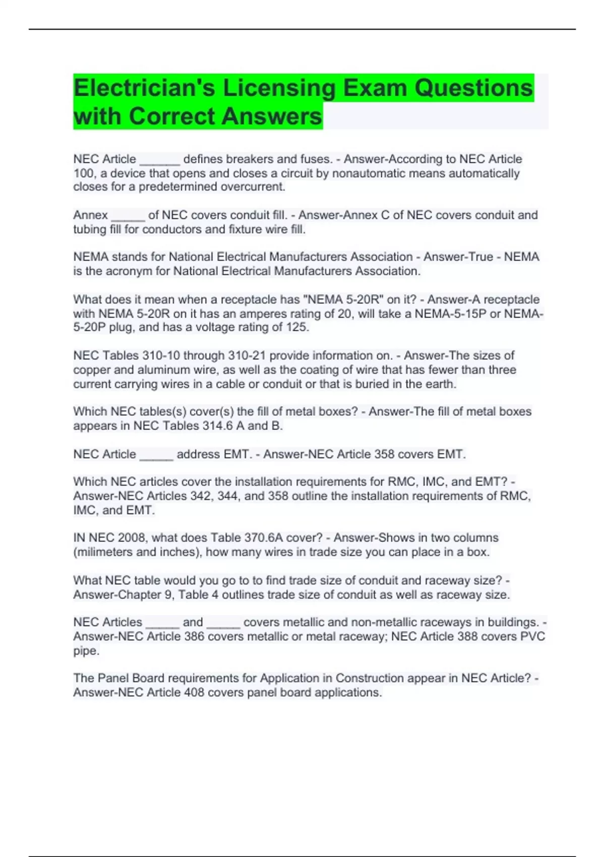 Electrician's Licensing Exam Questions with Correct Answers What kind of information does NEC Section 250-66 cover? - Answer-Covers the sizes of alternating current grounding electrode conductors. NEC Section 250-102 is devoted to equipment _____. - Answer-Equipment Bonding Jumpers Give guidelines for using sheet metal screws as bonding agents. - Answer-Electricians can use sheet metal screws for bonding when those screws are green and have hexagonal heads (NEC 250.8), but it is generally considered unwise. Which NEC article covers service drops? - Answer-NEC Article 230 According to NEC, trees are approved service conductors. (True or False) - Answer-False, NEC does not approve tress as service conductors. When a service entrance wire is under at least 2 in. of concrete, a disconnect is required between meter base and panel. (True or False) - Answer-False, No disconnect is required. Above sidewalks accessible by pedestrians, a service drop not over 600V must be at least _____ft. high. - Answer-10ft. What is the service drop distance, in feet, of a 200-amp service crossing residential property? - Answer-12ft. The required clearance for a 400-amp service drop across a major roadway is? - Answer-18ft. Describe the information covered in NEC Article 230.9 (A) - Answer-Covers clearances on buildings. According to NEC 230.9(A), an unsheathed service conductor must be _____ft. from a window that opens. - Answer-3ft. Which NEC Article covers grounding? - Answer-NEC Article 250 System and circuit grounding involves taking alternating current to ground? (True or False) - Answer-True The process of equipment _____ exposes current-carrying parts to a grounding system. - Answer-Grounding Small power tools are protected in what two ways? - Answer-1.Insulated Housings. 2. Ground prong on plugs.