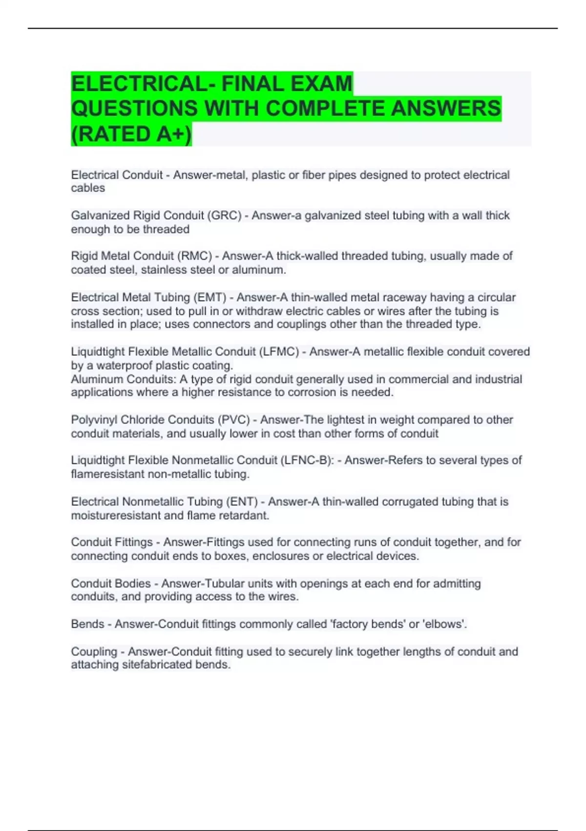 ELECTRICAL- FINAL EXAM QUESTIONS WITH COMPLETE ANSWERS (RATED A+) NEC - Answer-The National Electrical Code, which regulates the manner of installation and the types of wires and cables for various electrical applications. Wire Lettering - Answer-The letters THHN, THWN, THW and XHHN represent the main insulation types of individual wires. T (wire lettering) - Answer-Thermoplastic insulation H (wire lettering) - Answer-Heat resistance HH (wire lettering) - Answer-High heat resistance (up to 194°F) W (wire lettering) - Answer-Suitable for wet locations N (wire lettering) - Answer-Nylon coating, resistant to damage by oil or gas X (wire lettering) - Answer-Synthetic polymer that is flame-resistant Triplex Wires - Answer-An electrical cable composed of two insulated aluminum wires wrapped with a third bare wire which is used as a common neutral. Main Feeder Wires - Answer-Main power feeder wires are the wires that connect the service weather head to the building. Should be rated for 25% more than the actual load. Weather head - Answer-Connection point on building that is used to electrically connect the building to the utility. Panel Feed Wires - Answer-Electric wires used to power the main junction box and the circuit breaker panels. Should be rated for 25% more than the actual load. Non-Metallic Sheathed Wires - Answer-2-3 conductor wire used for instrumentation. Wire gauge - Answer-The size of the wire. Ampacity - Answer-The amount of electric current that can flow through a wire. Wattage - Answer-The load a wire can take.