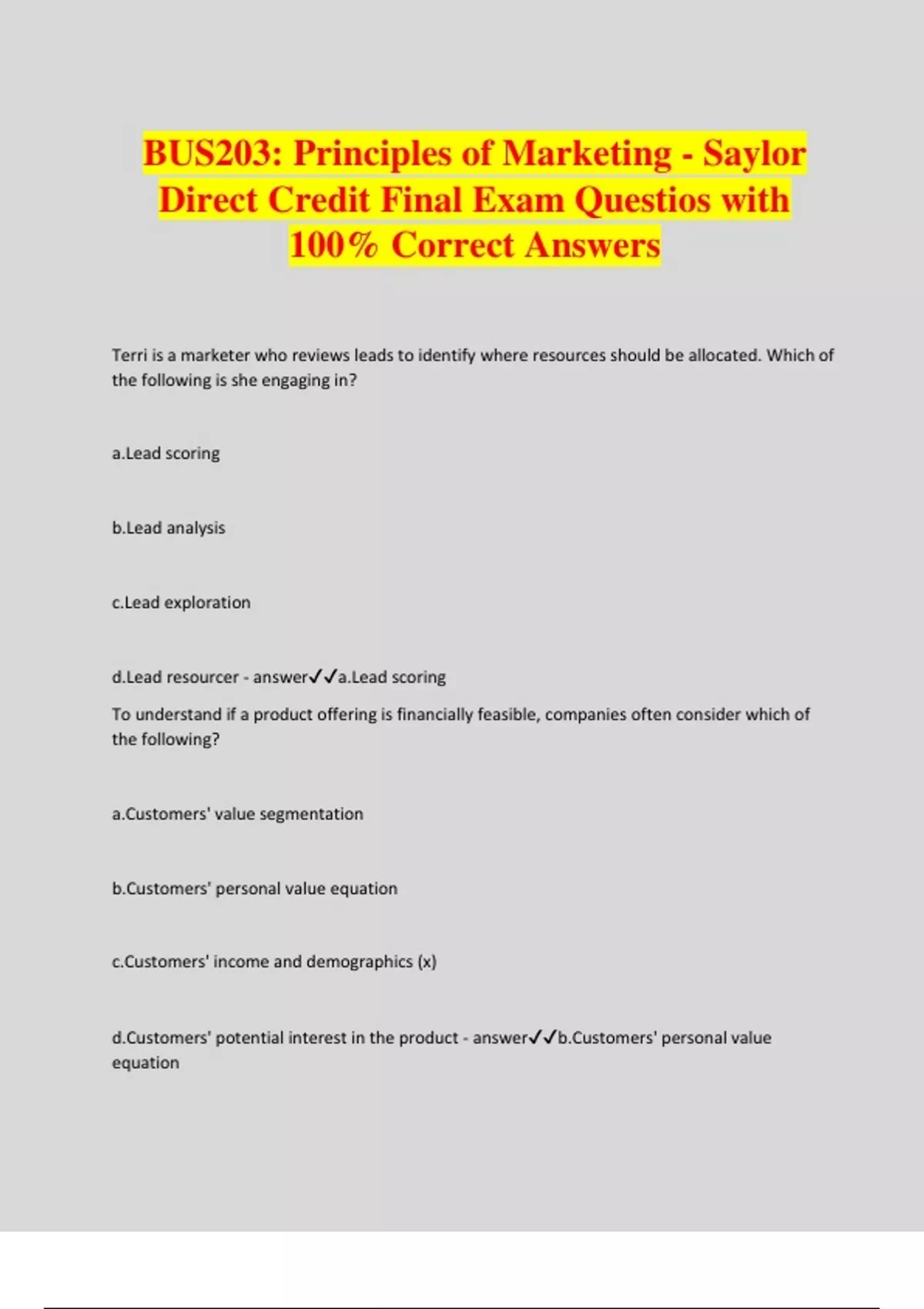BUS203: Principles of Marketing - Saylor Direct Credit Final Exam Questios with 100% Correct Answers Terri is a marketer who reviews leads to identify where resources should be allocated. Which of the following is she engaging in? a.Lead scoring b.Lead analysis c.Lead exploration d.Lead resourcer - answera.Lead scoring To understand if a product offering is financially feasible, companies often consider which of the following? a.Customers' value segmentation b.Customers' personal value equation c.Customers' income and demographics (x) d.Customers' potential interest in the product - answerb.Customers' personal value equation Pricing is the most important decision made by business. Of the following, which three perspectives are considered when pricing? a.Sales, customer, economic (x) b.Sales, employee, executive c.Customer, economic, societal d.Customer, societal, sales (x) - answerc. Customer, economic, societal What kind of business approach recognizes that consumers want value in both their products and services? a.Market-oriented (x) b.Product-oriented (x) c.Customer-oriented d.Service-oriented - answerc.Customer-oriented Which of the following is designed to deliver one consistent promotional message to a potential buyer? a.Integrated marketing communication (x) b.Advertising c.Personal Selling (x) d.Public Relation - answer What do companies use public relations to do? a.Build brand awareness through free advertising b.Create a favorable image for a brand c.Ensure a controlled audience response d.Attract investors and maintain a relationship with shareholders - answerb.Create a favorable image for a brand Which of the following describes the process of designing and manufacturing a product, and then bringing it to the market? a.Strategy b.Exchange c.Value chain d.Commercialization - answerc.Value chain Which of the following describes the proper order of the elements of marketing plan development? a.Research customer needs, create the right offerings, communicate value b.Communicate value, create the right offerings, launch promotional plan c.Research customer needs, develop corporate strategy, develop Mission Statement d.Develop corporate strategy,