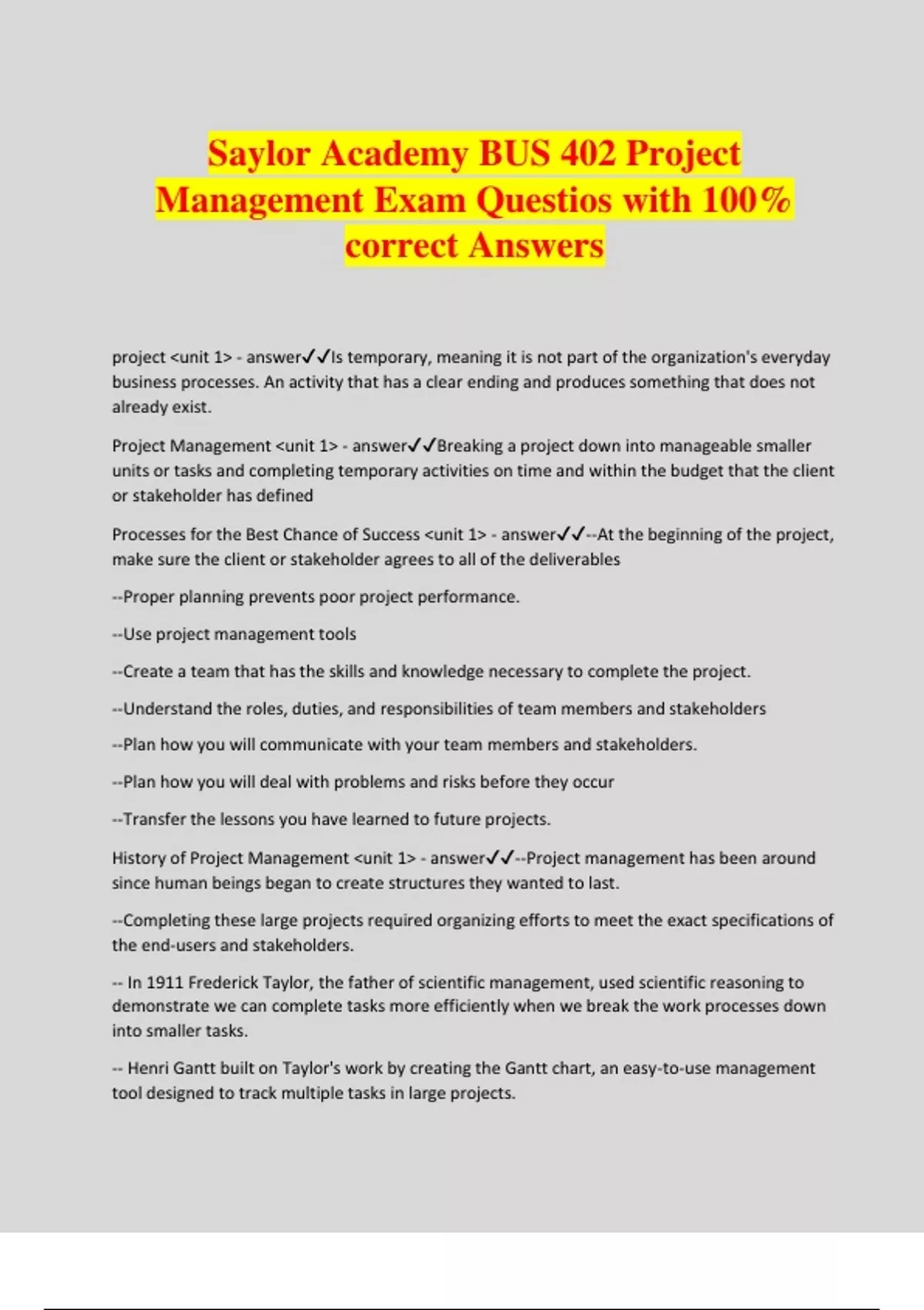 Saylor Academy BUS 402 Project Management Exam Questios with 100% correct Answers project <unit 1> - answerIs temporary, meaning it is not part of the organization's everyday business processes. An activity that has a clear ending and produces something that does not already exist. Project Management <unit 1> - answerBreaking a project down into manageable smaller units or tasks and completing temporary activities on time and within the budget that the client or stakeholder has defined Processes for the Best Chance of Success <unit 1> - answer--At the beginning of the project, make sure the client or stakeholder agrees to all of the deliverables --Proper planning prevents poor project performance. --Use project management tools --Create a team that has the skills and knowledge necessary to complete the project. --Understand the roles, duties, and responsibilities of team members and stakeholders --Plan how you will communicate with your team members and stakeholders. --Plan how you will deal with problems and risks before they occur --Transfer the lessons you have learned to future projects. History of Project Management <unit 1> - answer--Project management has been around since human beings began to create structures they wanted to last. --Completing these large projects required organizing efforts to meet the exact specifications of the end-users and stakeholders. -- In 1911 Frederick Taylor, the father of scientific management, used scientific reasoning to demonstrate we can complete tasks more efficiently when we break the work processes down into smaller tasks. -- Henri Gantt built on Taylor's work by creating the Gantt chart, an easy-to-use management tool designed to track multiple tasks in large projects. -- Similar tools include the program evaluation and review technique (PERT) and the critical path method (CPM). --With scientific managem