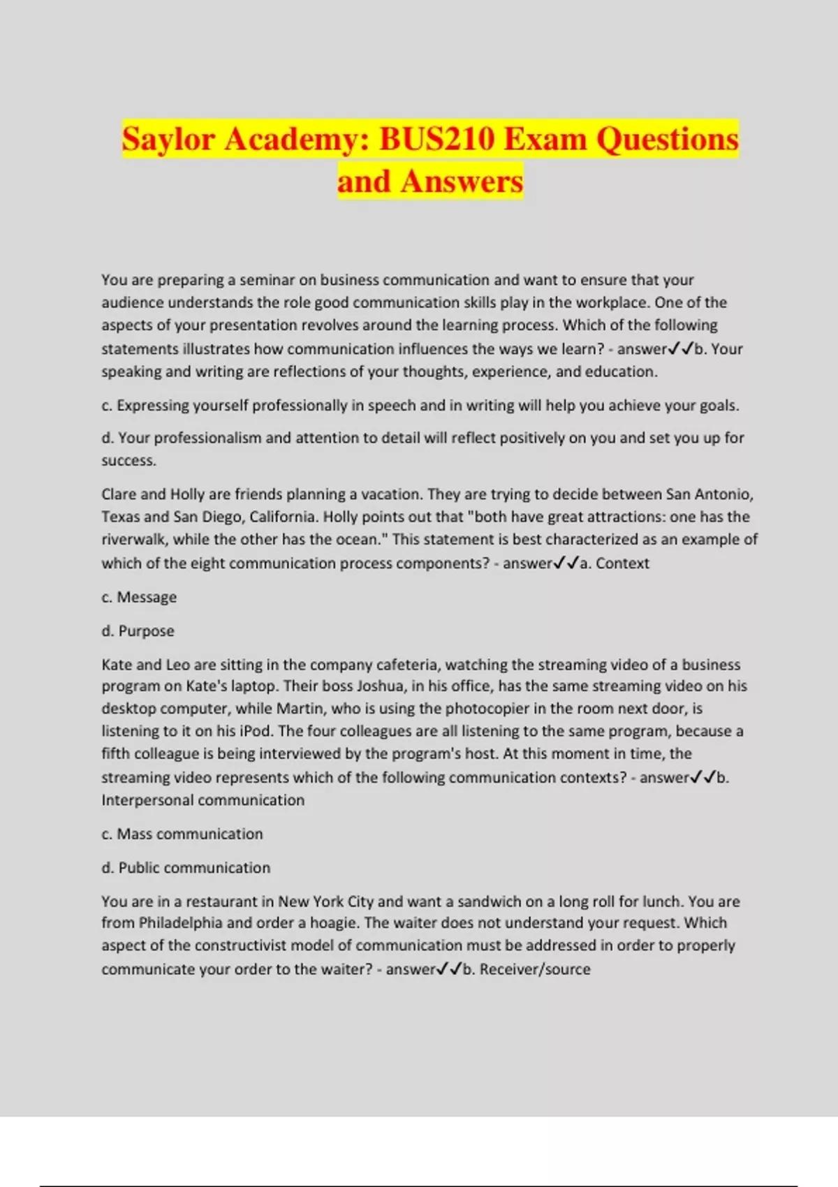 Saylor Academy: BUS210 Exam Questions and Answers You are preparing a seminar on business communication and want to ensure that your audience understands the role good communication skills play in the workplace. One of the aspects of your presentation revolves around the learning process. Which of the following statements illustrates how communication influences the ways we learn? - answerb. Your speaking and writing are reflections of your thoughts, experience, and education. c. Expressing yourself professionally in speech and in writing will help you achieve your goals. d. Your professionalism and attention to detail will reflect positively on you and set you up for success. Clare and Holly are friends planning a vacation. They are trying to decide between San Antonio, Texas and San Diego, California. Holly points out that "both have great attractions: one has the riverwalk, while the other has the ocean." This statement is best characterized as an example of which of the eight communication process components? - answera. Context c. Message d. Purpose Kate and Leo are sitting in the company cafeteria, watching the streaming video of a business program on Kate's laptop. Their boss Joshua, in his office, has the same streaming video on his desktop computer, while Martin, who is using the photocopier in the room next door, is listening to it on his iPod. The four colleagues are all listening to the same program, because a fifth colleague is being interviewed by the program's host. At this moment in time, the streaming video represents which of the following communication contexts? - answerb. Interpersonal communication c. Mass communication d. Public communication You are in a restaurant in New York City and want a sandwich on a long roll for lunch. You are from Philadelphia and order a hoagie. The waiter does not understand your request. Which aspect of the constructivist model of communication must be addressed in order to properly communicate your order to the waiter? - answerb. Receiver/source Which of the following are challenges ass