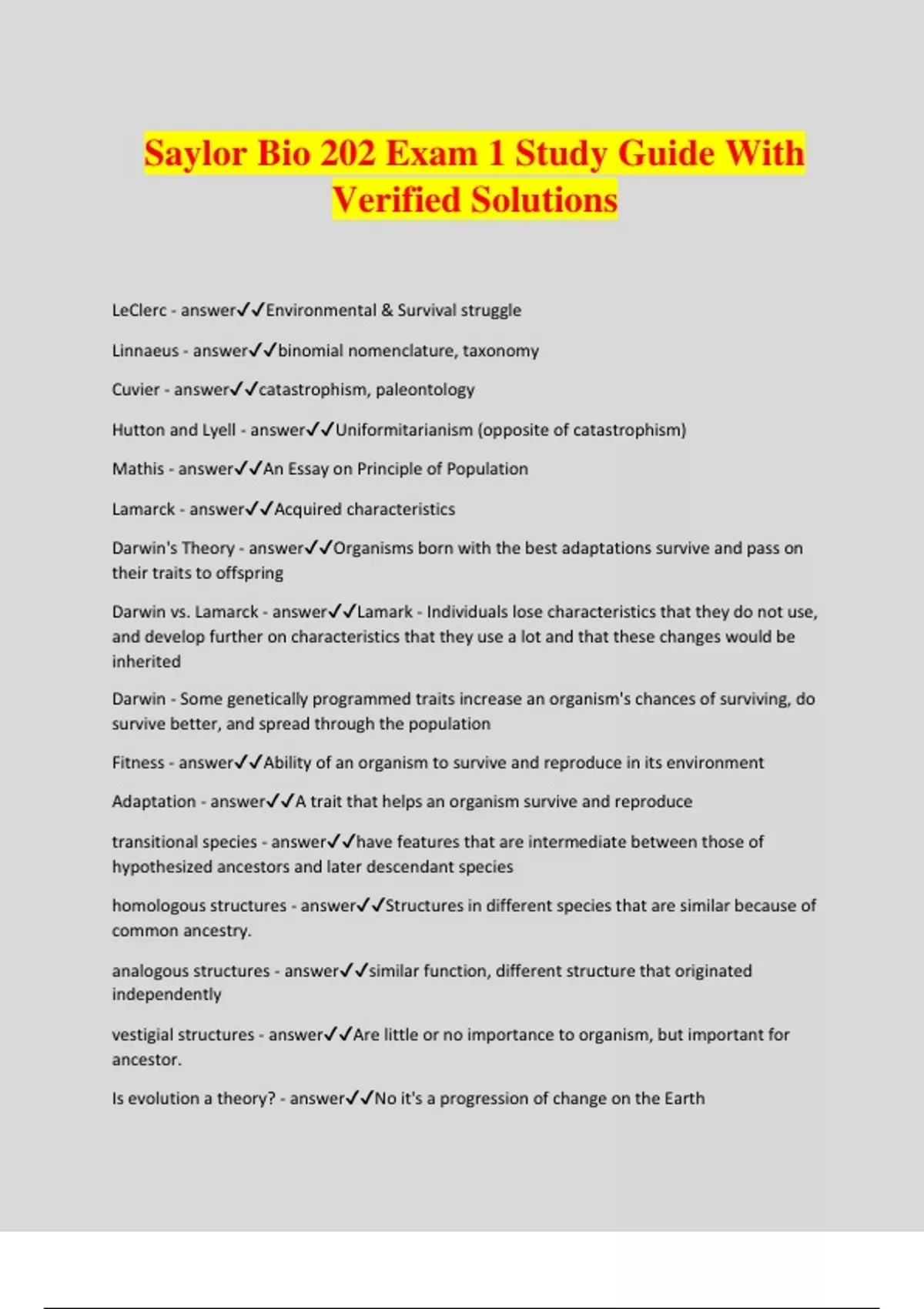 Saylor Bio 202 Exam 1 Study Guide With Verified Solutions