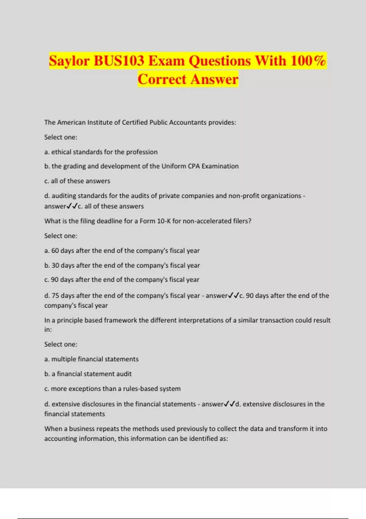 Saylor BUS103 Exam Questions With 100% Correct Answer The American Institute of Certified Public Accountants provides: Select one: a. ethical standards for the profession b. the grading and development of the Uniform CPA Examination c. all of these answers d. auditing standards for the audits of private companies and non-profit organizations - answerc. all of these answers What is the filing deadline for a Form 10-K for non-accelerated filers? Select one: a. 60 days after the end of the company's fiscal year b. 30 days after the end of the company's fiscal year c. 90 days after the end of the company's fiscal year d. 75 days after the end of the company's fiscal year - answerc. 90 days after the end of the company's fiscal year In a principle based framework the different interpretations of a similar transaction could result in: Select one: a. multiple financial statements b. a financial statement audit c. more exceptions than a rules-based system d. extensive disclosures in the financial statements - answerd. extensive disclosures in the financial statements When a business repeats the methods used previously to collect the data and transform it into accounting information, this information can be identified as: Select one: a. relevant b. reliable c. redundant d. consistent - answerd. consistent Which organization is responsible for developing generally accepted accounting principles? Select one: a. The GAAP group b. The American Institute of Certified Public Accountants c. The Financial Accounting Standards Board d. The Securities and exchange Commission - answera. The GAAP group Which of these is NOT an event that requires disclosure? Select one: a. a subsequent event b. a prior period adjustment c. a change in accounting principles d. a change in management style - answerd. a change in management style Which one of these is NOT a basic objective of financial reporting? Select one: a. to provide information that helps investors/creditors make lending decisions about the company b. to provide information to investors regarding a company's liquidity/solvency c. to provide information that helps the company make long-term decisions d. to provide a comprehensive account of all company activity - answerd. to provide a comprehensive account of all company activity Brian started a business and decided to incorporate it. He believed he had an outstanding business idea and wanted to share it with the world. Brian turned out to be right; his idea made him a wealthy man. Brian established this corporation and conducted business not as a small business owner but as the leader of a business he felt could continue operating indefinitely. Which accounting principle or objective best reflects this situation? Select one: a. Going concern assumption b. Cost principle c. Economic entity assumption d. Matching principle - answera. Going concern assumption According to the Full Disclosure Principle, what items require full disclosure? Select one: a. any inconsistent transactions on the balance sheet b. any unusual transactions involving stockholder's equity c. any transactions that take place after month end d. any information important enough to influence an informed user - answerd. any information important enough to influence an informed user The decision to disclose an event is based on? Select one: a. generally accepted accounting principles b. the timing of the event c. the voluntary principle d. materiality - answerd. materiality Generally Accepted Accounting Principles Methodology relies on: Select one: a. literature focused research b. a conceptual framework c. thorough review of facts d. question and answer sessions - answera. literature focused research A Form 10-K gives a comprehensive summary of _____________. Select one: a. a company's materi