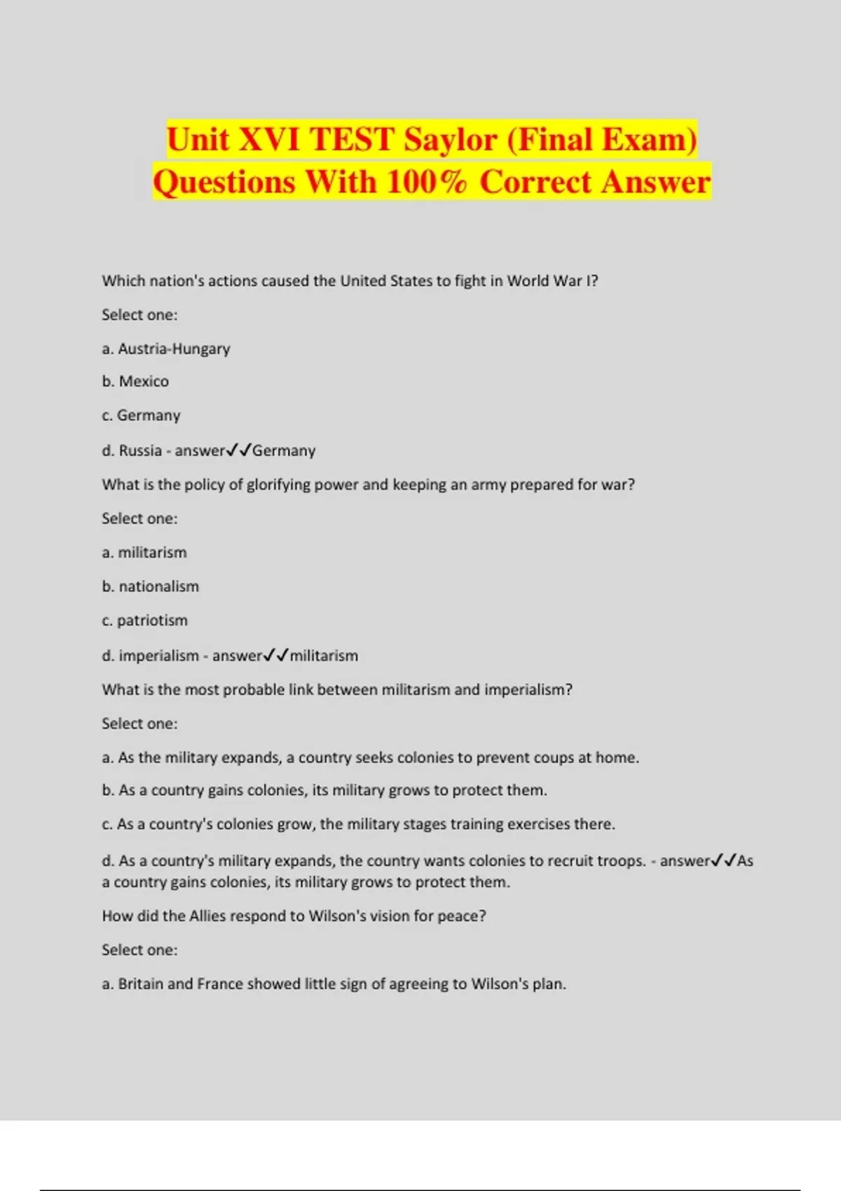 Unit XVI TEST Saylor (Final Exam) Questions With 100% Correct Answer Which nation's actions caused the United States to fight in World War I? Select one: a. Austria-Hungary b. Mexico c. Germany d. Russia - answerGermany What is the policy of glorifying power and keeping an army prepared for war? Select one: a. militarism b. nationalism c. patriotism d. imperialism - answermilitarism What is the most probable link between militarism and imperialism? Select one: a. As the military expands, a country seeks colonies to prevent coups at home. b. As a country gains colonies, its military grows to protect them. c. As a country's colonies grow, the military stages training exercises there. d. As a country's military expands, the country wants colonies to recruit troops. - answerAs a country gains colonies, its military grows to protect them. How did the Allies respond to Wilson's vision for peace? Select one: a. Britain and France showed little sig