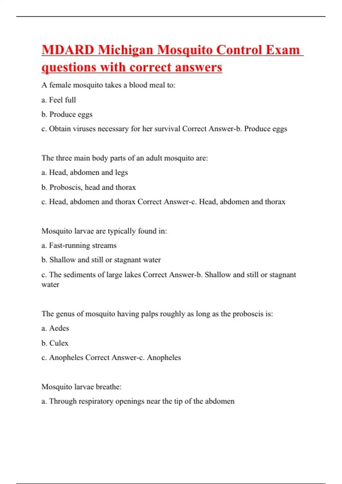 MDARD Michigan Mosquito Control Exam questions with correct answers A female mosquito takes a blood meal to: a. Feel full b. Produce eggs c. Obtain viruses necessary for her survival Correct Answer-b. Produce eggs The three main body parts of an adult mosquito are: a. Head, abdomen and legs b. Proboscis, head and thorax c. Head, abdomen and thorax Correct Answer-c. Head, abdomen and thorax Mosquito larvae are typically found in: a. Fast-running streams b. Shallow and still or stagnant water c. The sediments of large lakes Correct Answer-b. Shallow and still or stagnant water The genus of mosquito having palps roughly as long as the proboscis is: a. Aedes b. Culex c. Anopheles Correct Answer-c. Anopheles Mosquito larvae breathe: a. Through respiratory openings near the tip of the abdomen b. Through gills located just behind the head c. By surfacing and gulping air with their mouths Correct Answer-a. Through respiratory openings near the tip of the abdomen Some mosquitoes lay their eggs: a. On damp soil b. On their hosts (birds or mammals) c. On agricultural crops (e.g., corn plants) Correct Answer-a. On damp soil The number of mosquito species in Michigan is approximately: a. More than 100 b. 80 c. 60 Correct Answer-c. 60 A mosquito goes through four stages of development: a. Egg, larva, pupa and adult b. Egg, first instar, larva and pupa c. Larva, pupa, nymph and adult Correct Answer-a. Egg, larva, pupa and adult The three classes of Michigan mosquitoes, based on breeding sites, are: a. Floodwater, permanent water and storm water breeders b. Floodwater, permanent water, and container/tree hole mosquitoes c. Temporary pond, lake and marsh, and floodwater mosquitoes Correct Answer-b. Floodwater, permanent water, and container/tree hole mosquitoes Insects that are often confused with mosquitoes are: