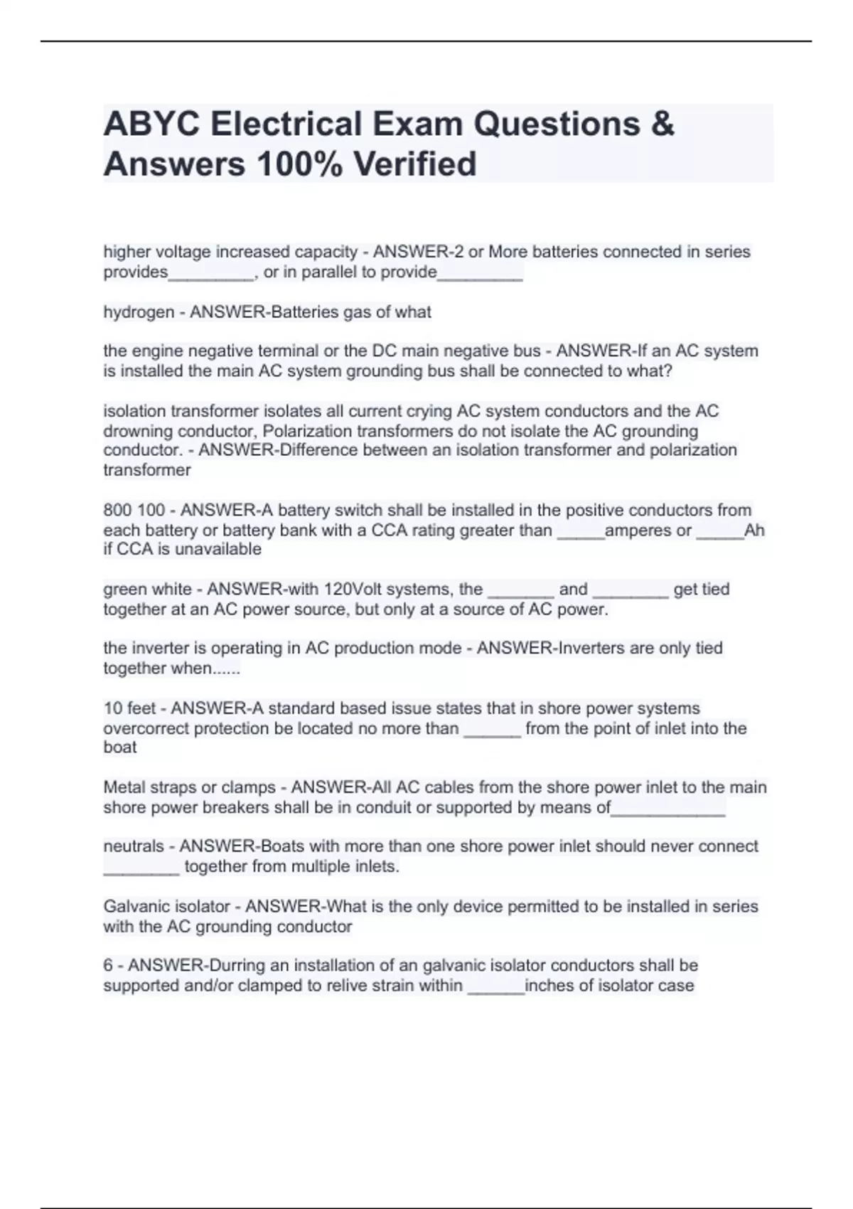 ABYC Electrical Exam Questions & Answers 100% Verified higher voltage increased capacity - ANSWER-2 or More batteries connected in series provides_________, or in parallel to provide_________ hydrogen - ANSWER-Batteries gas of what the engine negative terminal or the DC main negative bus - ANSWER-If an AC system is installed the main AC system grounding bus shall be connected to what? isolation transformer isolates all current crying AC system conductors and the AC drowning conductor, Polarization transformers do not isolate the AC grounding conductor. - ANSWER-Difference between an isolation transformer and polarization transformer 800 100 - ANSWER-A battery switch shall be installed in the positive conductors from each battery or battery bank with a CCA rating greater than _____amperes or _____Ah if CCA is unavailable green white - ANSWER-with 120Volt systems, the _______ and ________ get tied together at an AC power source, but only at a source of AC power. the inverter is operating in AC production mode - ANSWER-Inverters are only tied together when...... 10 feet - ANSWER-A standard based issue states that in shore power systems overcorrect protection be located no more than ______ from the point of inlet into the boat Metal straps or clamps - ANSWER-All AC cables from the shore power inlet to the main s