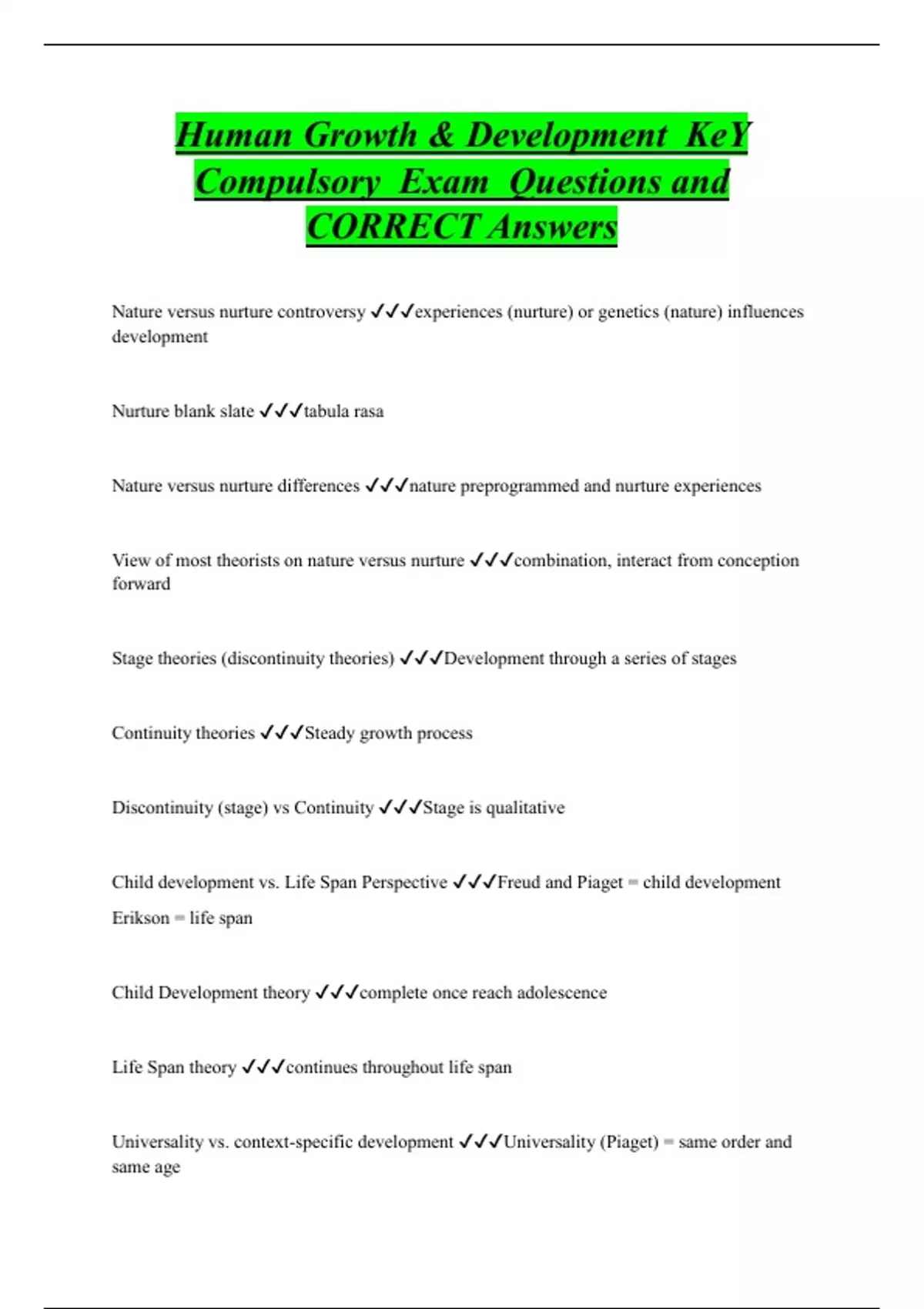 Human Growth & Development KeY Compulsory Exam Questions and CORRECT Answers
