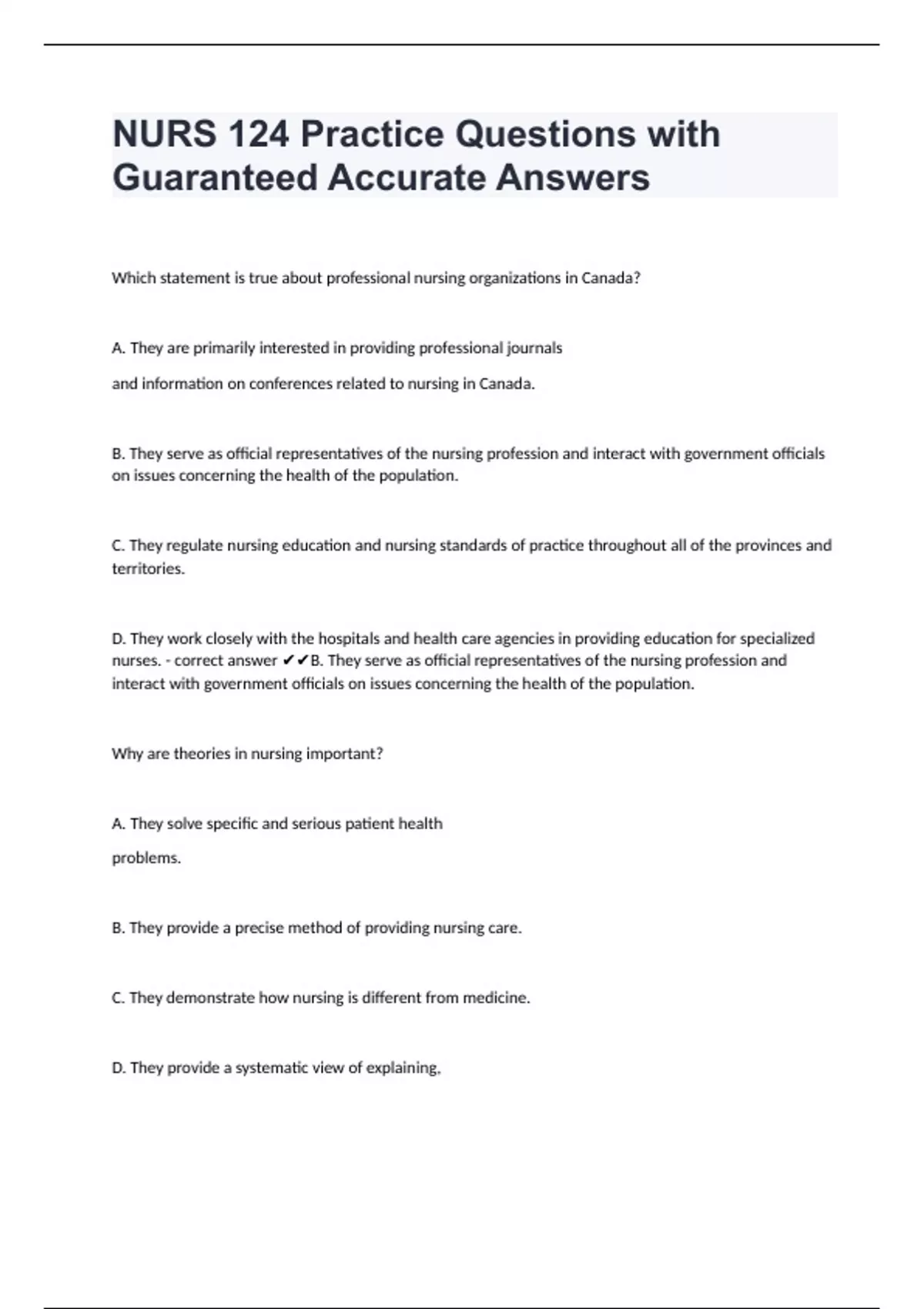 Which statement is true about professional nursing organizations in Canada? A. They are primarily interested in providing professional journals and information on conferences related to nursing in Canada. B. They serve as official representatives of the nursing profession and interact with government officials on issues concerning the health of the population. C. They regulate nursing education and nursing standards of practice throughout all of the provinces and territories. D. They work closely with the hospitals and health care agencies in providing education for specialized nurses. - correct answer B. They serve as official representatives of the nursing profession and interact with government officials on issues concerning the health of the population. Why are theories in nursing important? A. They solve specific and serious patient health problems. B. They provide a precise method of providing nursing care. C. They demonstrate how nursing is different from medicine. D. They provide a systematic view of explaining, predicting, and describing phenomena. - correct answer D. They provide a systematic view of explaining, predicting, and describing phenomena. Which of the following is an example of a nursing theory? A. Systems theory B. Nursing assessment C. Self-actualization theory D. Health care belief model - correct answer A. Systems theory Which statement about nursing is true? A. It is a discipline that has its own unique science. B. Is not a true science but rather an art. C. It is a discipline that is still trying to create its theories. D. It has a number of theories that are interrelated. - correct answer A. It is a discipline that has its own unique science. A theory is best understood as a set of assumptions or propositions that becomes useful when it does which of the following? A. Helps people meet their self-care needs. B. Isolates concepts. C. Helps the nurse implement care. D. Provides a systematic view of explaining, predicting, and prescribing phenomena. - correct answer D. Provides a systematic view of explaining, predicting, and prescribing phenomena. The enterprise of theorizing about nursing practice was primarily driven by? A. Physicians