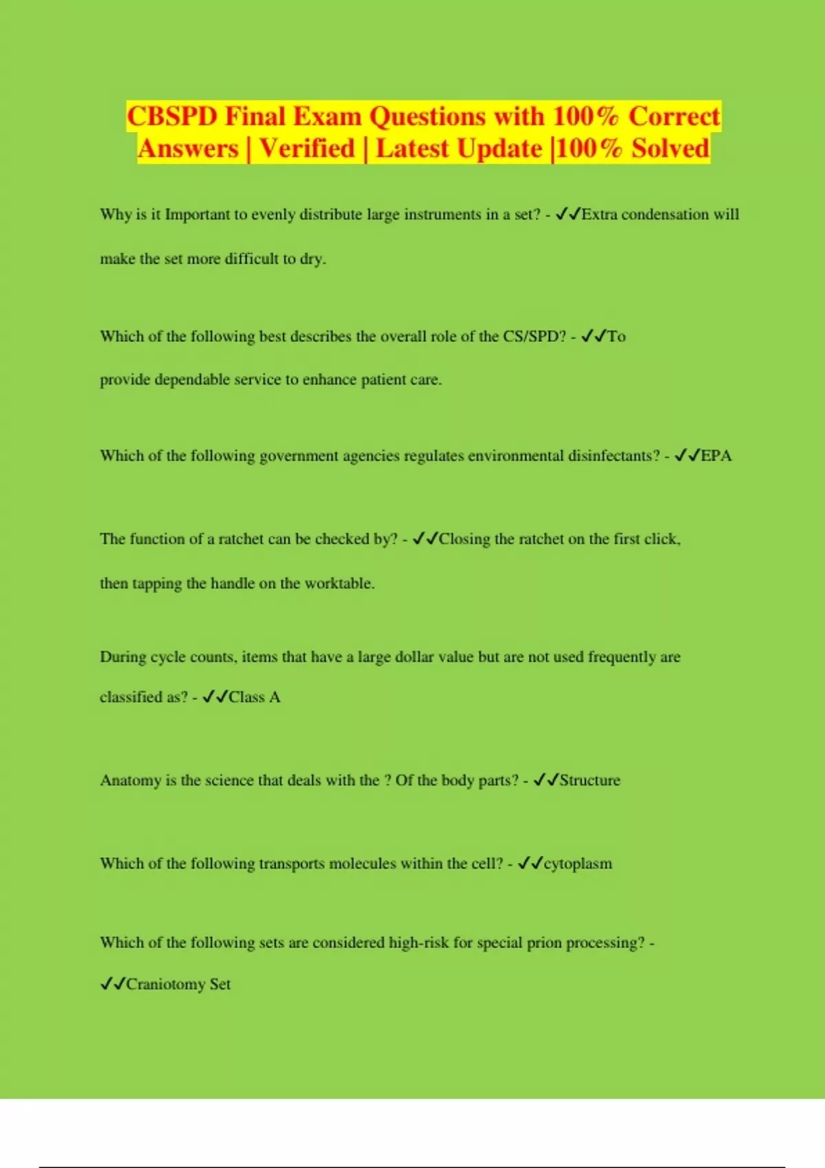 CBSPD Final Exam Questions with 100% Correct Answers | Verified | Latest Update |100% Solved Why is it Important to evenly distribute large instruments in a set? - Extra condensation will make the set more difficult to dry. Which of the following best describes the overall role of the CS/SPD? - To provide dependable service to enhance patient care. Which of the following government agencies regulates environmental disinfectants? - EPA The function of a ratchet can be checked by? - Closing the ratchet on the first click, then tapping the handle on the worktable. During cycle counts, items that have a large dollar value but are not used frequently are classified as? - Class A Anatomy is the science that deals with the ? Of the body parts? - Structure Which of the following transports molecules within the cell? - cytoplasm Which of the following sets are considered high-risk for special prion processing? - Craniotomy Set