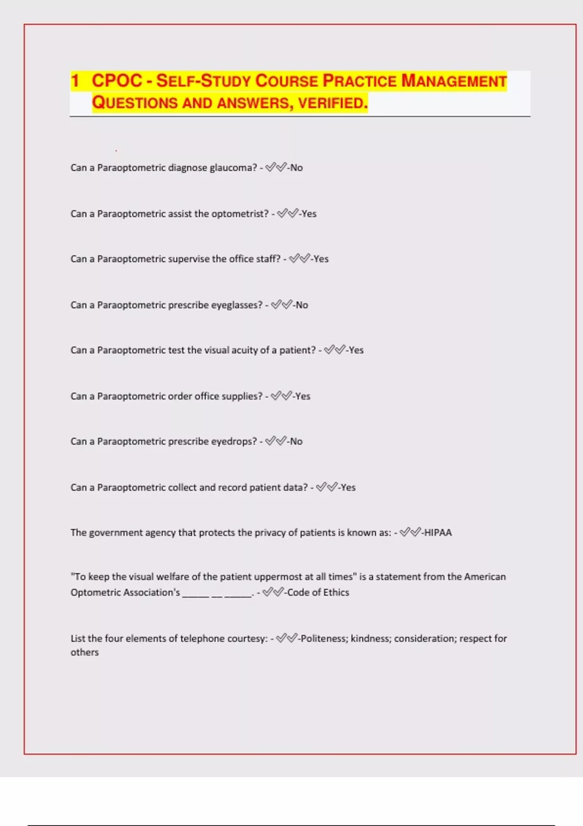 CPOC - SELF-STUDY COURSE PRACTICE MANAGEMENT QUESTIONS AND ANSWERS, VERIFIED. Can a Paraoptometric diagnose glaucoma? - -No Can a Paraoptometric assist the optometrist? - -Yes Can a Paraoptometric supervise the office staff? - -Yes Can a Paraoptometric prescribe eyeglasses? - -No Can a Paraoptometric test the visual acuity of a patient? - -Yes Can a Paraoptometric order office supplies? - -Yes Can a Paraoptometric prescribe eyedrops? - -No Can a Paraoptometric collect and record patient data? - -Yes The government agency that protects the privacy of patients is known as: - -HIPAA "To keep the visual welfare of the patient uppermost at all times" is a statement from the American Optometric Association's _____ __ _____. - -Code of Ethics List the four elements of telephone courtesy: - -Politeness; kindness; considerat