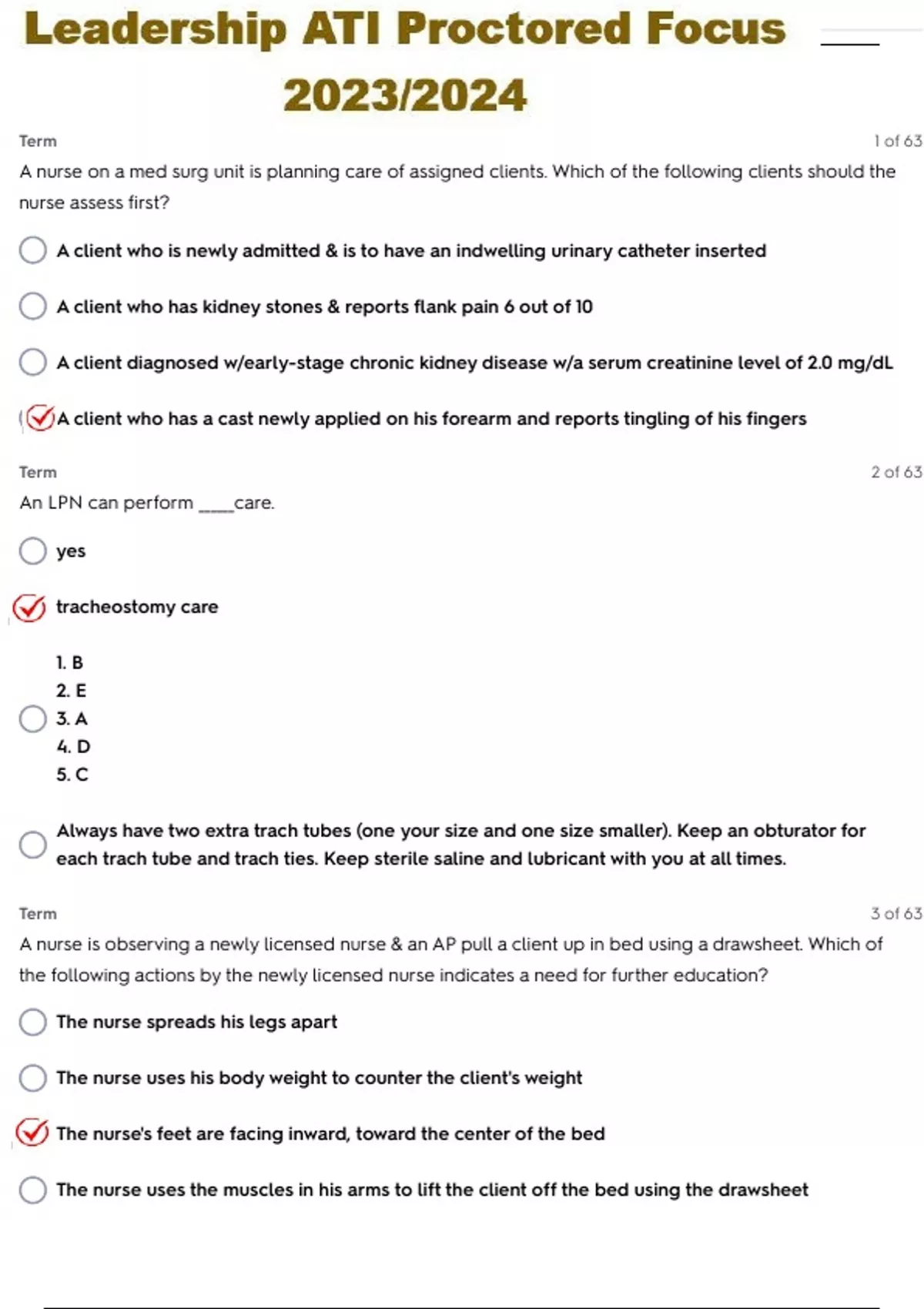 Leadership ATI Proctored Focus 2023/2024 A nurse on a med surg unit is planning care of assigned clients. Which of the following clients should the nurse assess first? A client who is newly admitted & is to have an indwelling urinary catheter inserted A client who has kidney stones & reports flank pain 6 out of 10 A client diagnosed w/early-stage chronic kidney disease w/a serum creatinine level of 2.0 mg/dL A client who has a cast newly applied on his forearm and reports tingling of his fingers