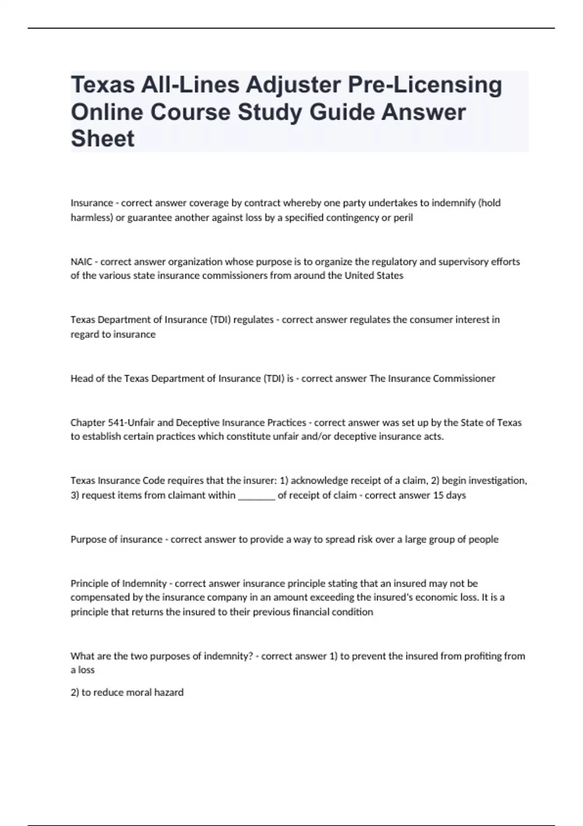 Texas All-Lines Adjuster Pre-Licensing Online Course Study Guide Answer Sheet 2024/2025 passed