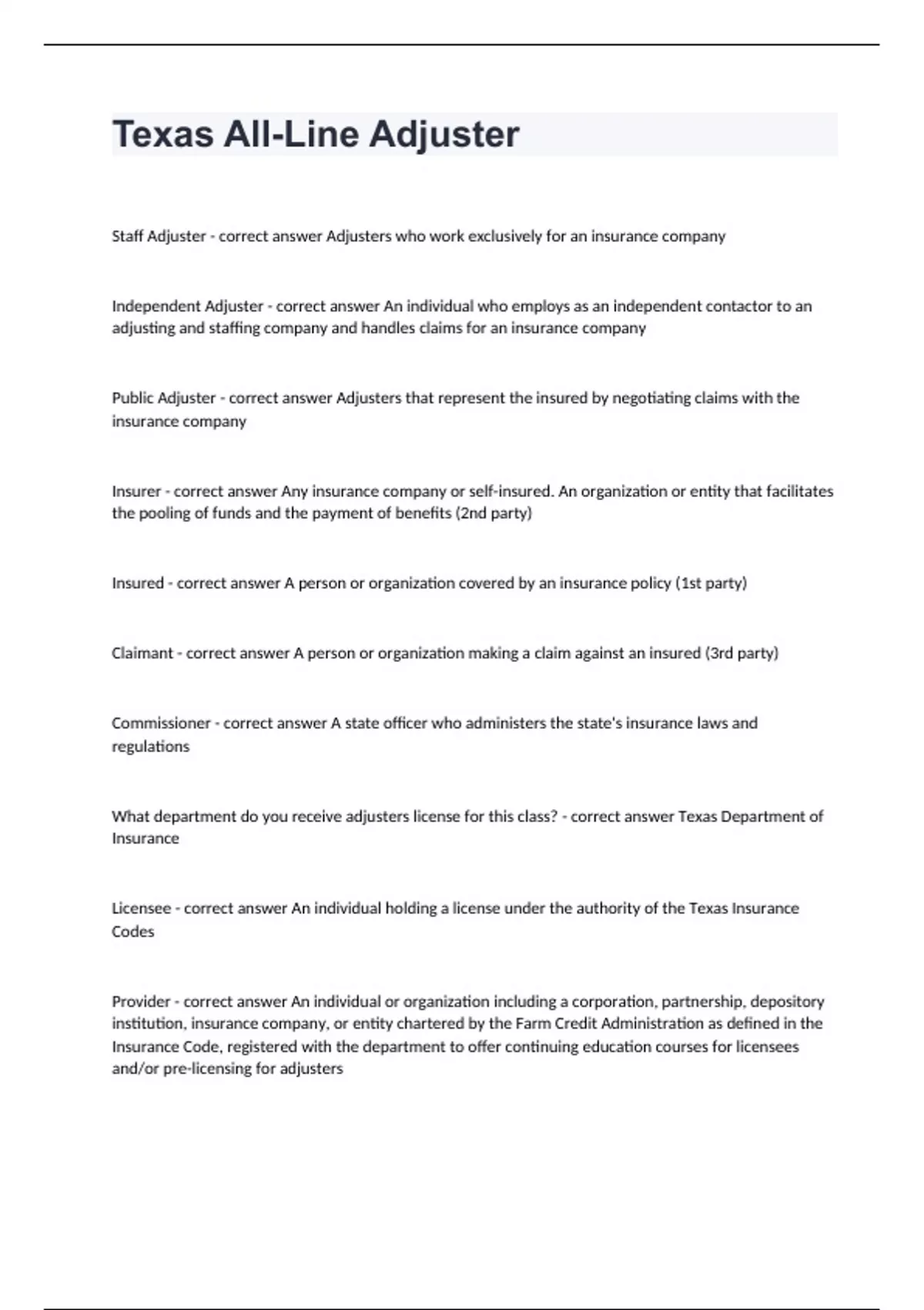 Texas All-Line AdjusterStaff Adjuster - correct answer Adjusters who work exclusively for an insurance company Independent Adjuster - correct answer An individual who employs as an independent contactor to an adjusting and staffing company and handles claims for an insurance company Public Adjuster - correct answer Adjusters that represent the insured by negotiating claims with the insurance company Insurer - correct answer Any insurance company or self-insured. An organization or entity that facilitates the pooling of funds and the payment of benefits (2nd party) Insured - correct answer A person or organization covered by an insurance policy (1st party) Claimant - correct answer A person or organization making a claim against an insured (3rd party) Commissioner - correct answer A state officer who administers the state's insurance laws and regulations What department do you receive adjusters license for this class? - correct answer Texas Department of Insurance Licensee - correct answer An individual holding a license under the authority of the Texas Insurance Codes Provider - correct answer An individual or organization including a corporation, partnership, depository institution, insurance company, or entity chartered by the Farm Credit Administration as defined in the Insurance Code, registered with the department to offer continuing education courses for licensees and/or pre-licensing for adjusters Texas Department of Insurance License Number - correct answer An ID number the