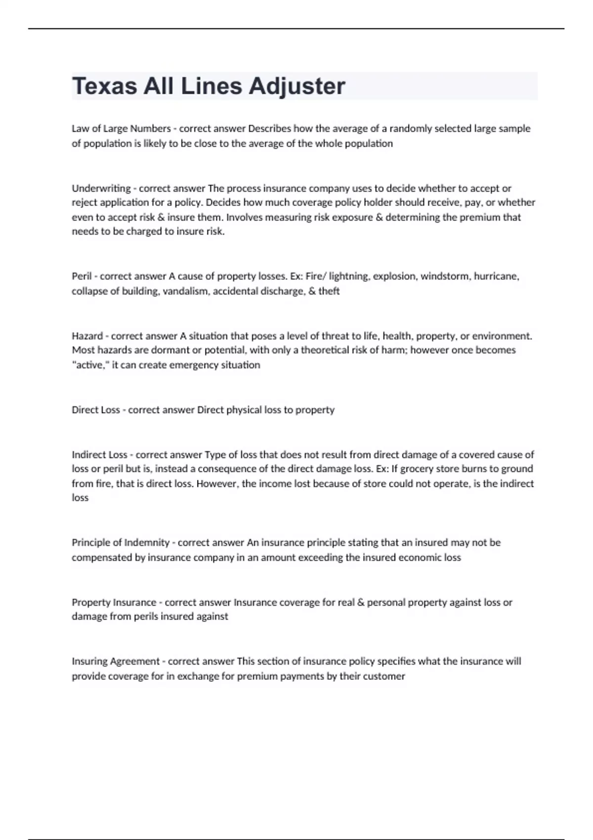 Texas All Lines AdjusterLaw of Large Numbers - correct answer Describes how the average of a randomly selected large sample of population is likely to be close to the average of the whole population Underwriting - correct answer The process insurance company uses to decide whether to accept or reject application for a policy. Decides how much coverage policy holder should receive, pay, or whether even to accept risk & insure them. Involves measuring risk exposure & determining the premium that needs to be charged to insure risk. Peril - correct answer A cause of property losses. Ex: Fire/ lightning, explosion, windstorm, hurricane, collapse of building, vandalism, accidental discharge, & theft Hazard - correct answer A situation that poses a level of threat to life, health, property, or environment. Most hazards are dormant or potential, with only a theoretical risk of harm; however once becomes "active," it can create emergency situation Direct Loss - correct answer Direct physical loss to property Indirect Loss - correct answer Type of loss that does not result from direct damage of a covered cause of loss or peril but is, instead a consequence of the direct damage loss. Ex: If grocery store burns to ground from fire, that is direct loss. However, the income lost because of store could not operate, is the indirect loss Principle of Indemnity - correct answer An insurance principle stating that an insured may not be compensated by insurance company in an amount exceeding the insured economic loss Property Insurance - correct answer Insurance coverage for real & personal property against loss or damage from perils insured against Insuring Agreement - correct answer This section of insurance policy specifies what the insurance will provide coverage for in exchange for premium payments by their customer