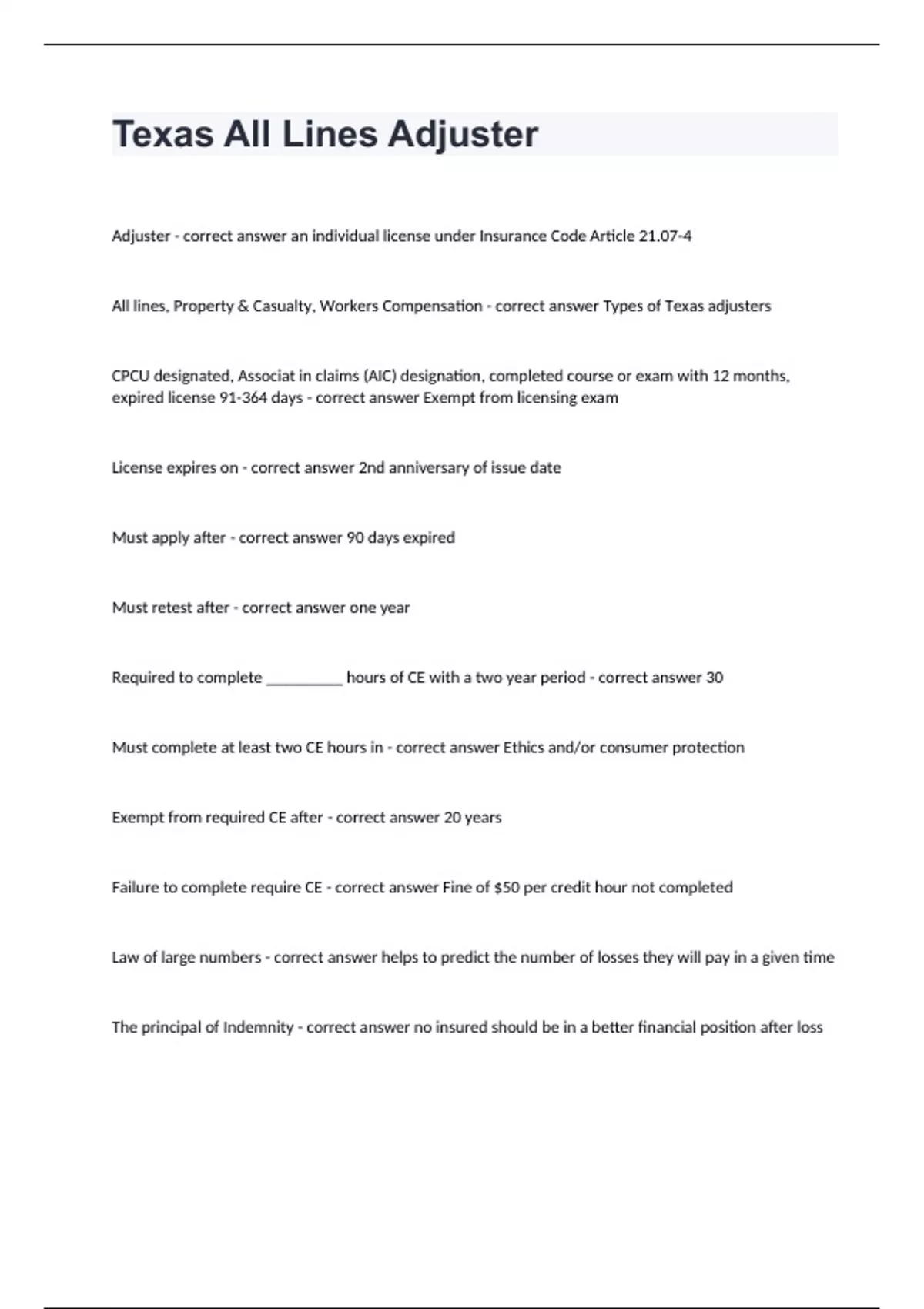 Texas All Lines AdjusterAdjuster - correct answer an individual license under Insurance Code Article 21.07-4 All lines, Property & Casualty, Workers Compensation - correct answer Types of Texas adjusters CPCU designated, Associat in claims (AIC) designation, completed course or exam with 12 months, expired license 91-364 days - correct answer Exempt from licensing exam License expires on - correct answer 2nd anniversary of issue date Must apply after - correct answer 90 days expired Must retest after - correct answer one year Required to complete _________ hours of CE with a two year period - correct answer 30 Must complete at least two CE hours in - correct answer Ethics and/or consumer protection Exempt from required CE after - correct answer 20 years Failure to complete require CE - correct answer Fine of $50 per credit hour not completed Law of large numbers - correct answer helps to predict the number of losses they will pay in a given time The principal of Indemnity - correct answer no insured should be in a better financial position after loss The Principal of Insurable Interest - correct answer a party must have an insurable interest to purchase insurance. Contract - correct answer a legal agreement between two competent parties that promises a certain performance in exchange for a certain considerations Considerations - correct answer something of value- may consist of money, an act, a promise or giving up a legal right In insurance contract the _____________ __ __________ is the promise to pay if a loss occurs - correct answer Consideration of the insurer In insurance contract the ___________ __ ____________ is the policy premium and promise to meet conditions of the contract. - correct answer considerations of the insured Competent parties - correct answer Legal requirement for those accepting an offer. Legal Purpose - correct answer Essential element of an agreement incontract law-must comply with laws and public policy Contract of adhesion - correct answer one party has substantially more power than the other in creating the contract. Aleatory contract - correct answer performance depends on the occurrence of a certain event Personal contract - correct answer a contract that binds a person but does not include such person's heirs or assignees since the contract requires a personal performance that does not have an adequate substitute. Unilateral contracts - correct answer ,an act is exchanged for a promise. Once the insured pays the policy premium,
