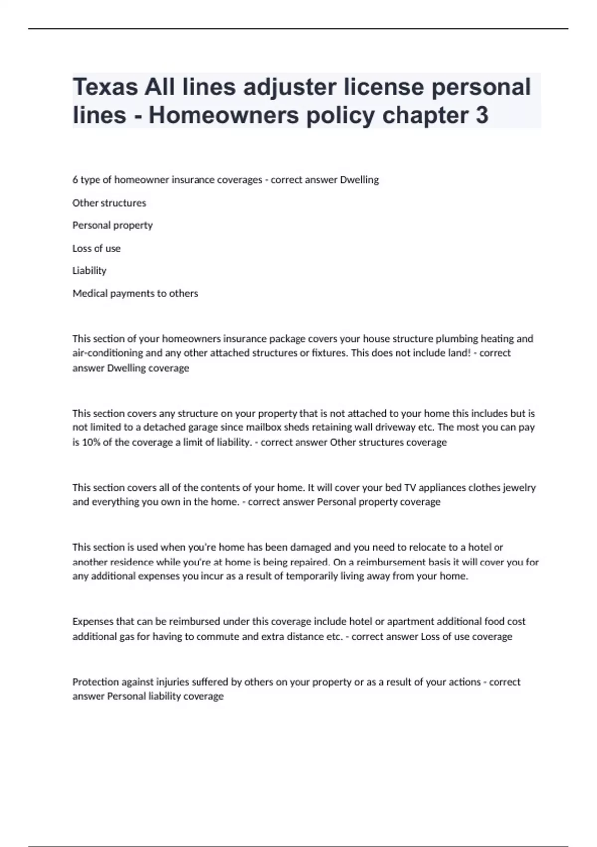 Texas All lines adjuster license personal lines - Homeowners policy chapter 36 type of homeowner insurance coverages - correct answer Dwelling Other structures Personal property Loss of use Liability Medical payments to others This section of your homeowners insurance package covers your house structure plumbing heating and air-conditioning and any other attached structures or fixtures. This does not include land! - correct answer Dwelling coverage This section covers any structure on your property that is not attached to your home this includes but is not limited to a detached garage since mailbox sheds retaining wall driveway etc. The most you can pay is 10% of the coverage a limit of liability. - correct answer Other structures coverage This section covers all of the contents of your home. It will cover your bed TV appliances clothes jewelry and everything you own in the home. - correct answer Personal property coverage This section is used when you're home has been damaged and you need to relocate to a hotel or another residence while you're at home is being repaired. On a reimbursement basis it will cover you for any additional expenses you incur as a result of temporarily living away from your home. Expenses that can be reimbursed under this coverage include hotel or apartment additional food cost additional gas for having to commute and extra distance etc. - correct answer Loss of use coverage Protection against injuries suffered by others on your property or as a result of your actions - correct answer Personal liability coverage