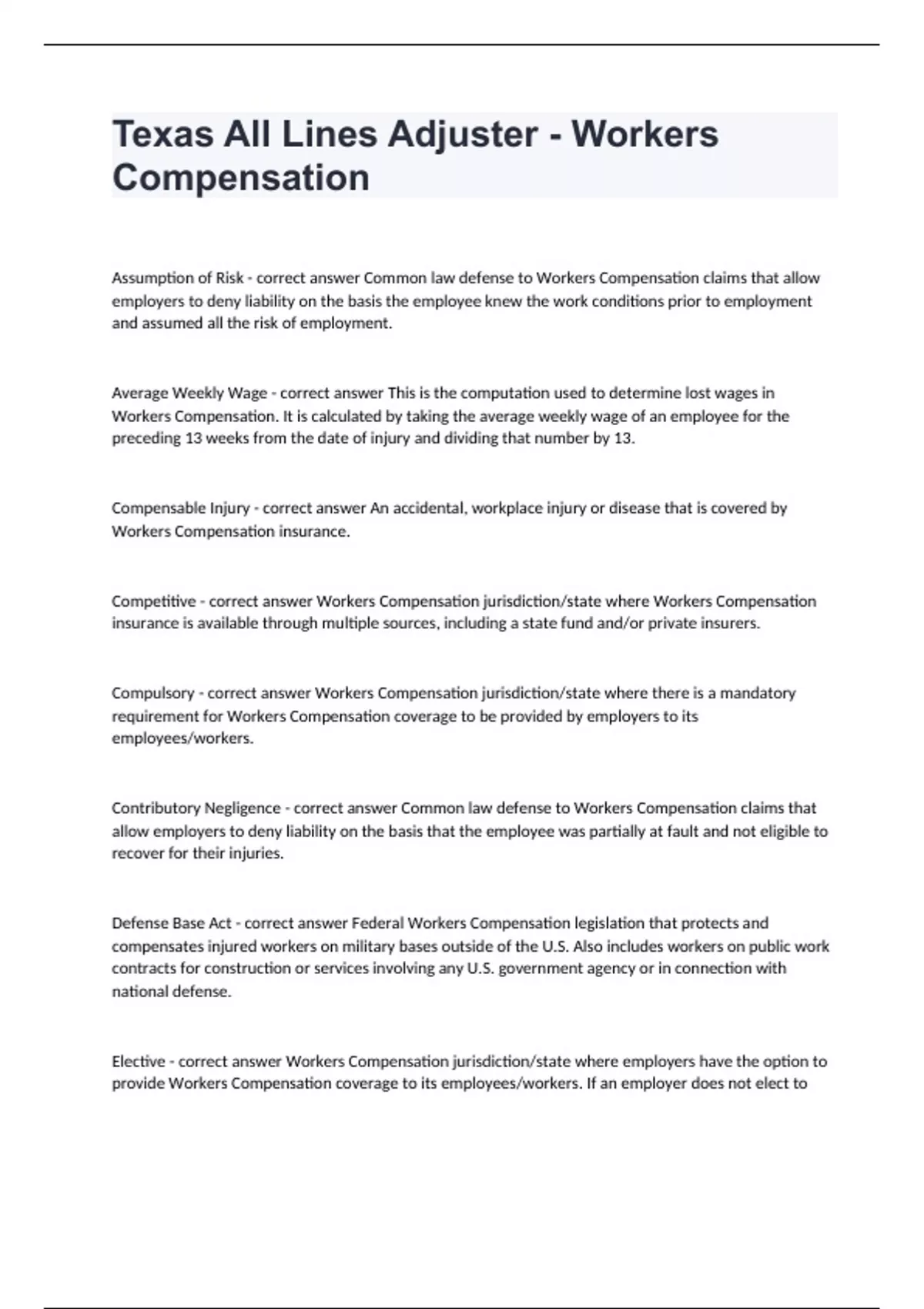 Texas All Lines Adjuster - Workers CompensationAssumption of Risk - correct answer Common law defense to Workers Compensation claims that allow employers to deny liability on the basis the employee knew the work conditions prior to employment and assumed all the risk of employment. Average Weekly Wage - correct answer This is the computation used to determine lost wages in Workers Compensation. It is calculated by taking the average weekly wage of an employee for the preceding 13 weeks from the date of injury and dividing that number by 13. Compensable Injury - correct answer An accidental, workplace injury or disease that is covered by Workers Compensation insurance. Competitive - correct answer Workers Compensation jurisdiction/state where Workers Compensation insurance is available through multiple sources, including a state fund and/or private insurers. Compulsory - correct answer Workers Compensation jurisdiction/state where there is a mandatory requirement for Workers Compensation coverage to be provided by employers to its employees/workers. Contributory Negligence - correct answer Common law defense to Workers Compensation claims that allow employers to deny liability on the basis that the employee was partially at fault and not eligible to recover for their injuries. Defense Base Act - correct answer Federal Workers Compensation legislation that protects and compensates injured workers on military bases outside of the U.S. Also includes workers on public work contracts for construction or services involving any U.S. government agency or in connection with national defense. Elective - correct answer Workers Compensation jurisdiction/state where employers have the option to provide Workers Compensation coverage to its employees/workers. If an