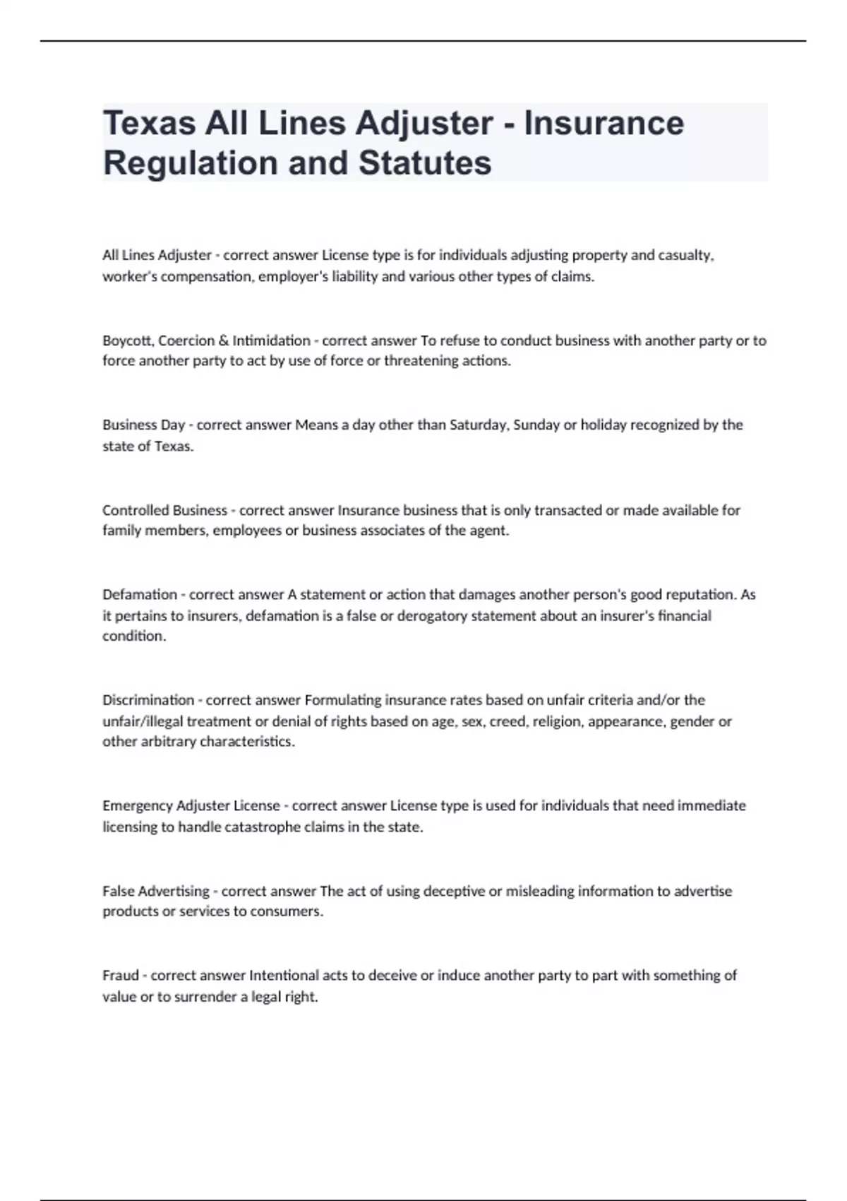 Texas All Lines Adjuster - Insurance Regulation and StatutesAll Lines Adjuster - correct answer License type is for individuals adjusting property and casualty, worker's compensation, employer's liability and various other types of claims. Boycott, Coercion & Intimidation - correct answer To refuse to conduct business with another party or to force another party to act by use of force or threatening actions. Business Day - correct answer Means a day other than Saturday, Sunday or holiday recognized by the state of Texas. Controlled Business - correct answer Insurance business that is only transacted or made available for family members, employees or business associates of the agent. Defamation - correct answer A statement or action that damages another person's good reputation. As it pertains to insurers, defamation is a false or derogatory statement about an insurer's financial condition. Discrimination - correct answer Formulating insurance rates based on unfair criteria and/or the unfair/illegal treatment or denial of rights based on age, sex, creed, religion, appearance, gender or other arbitrary characteristics. Emergency Adjuster License - correct answer License type is used for individuals that need immediate licensing to handle catastrophe claims in the state. False Advertising - correct answer The act of using deceptive or misleading information to advertise products or services to consumers. Fraud - correct answer Intentional acts to deceive or induce another party to part with something of value or to surrender a legal right.