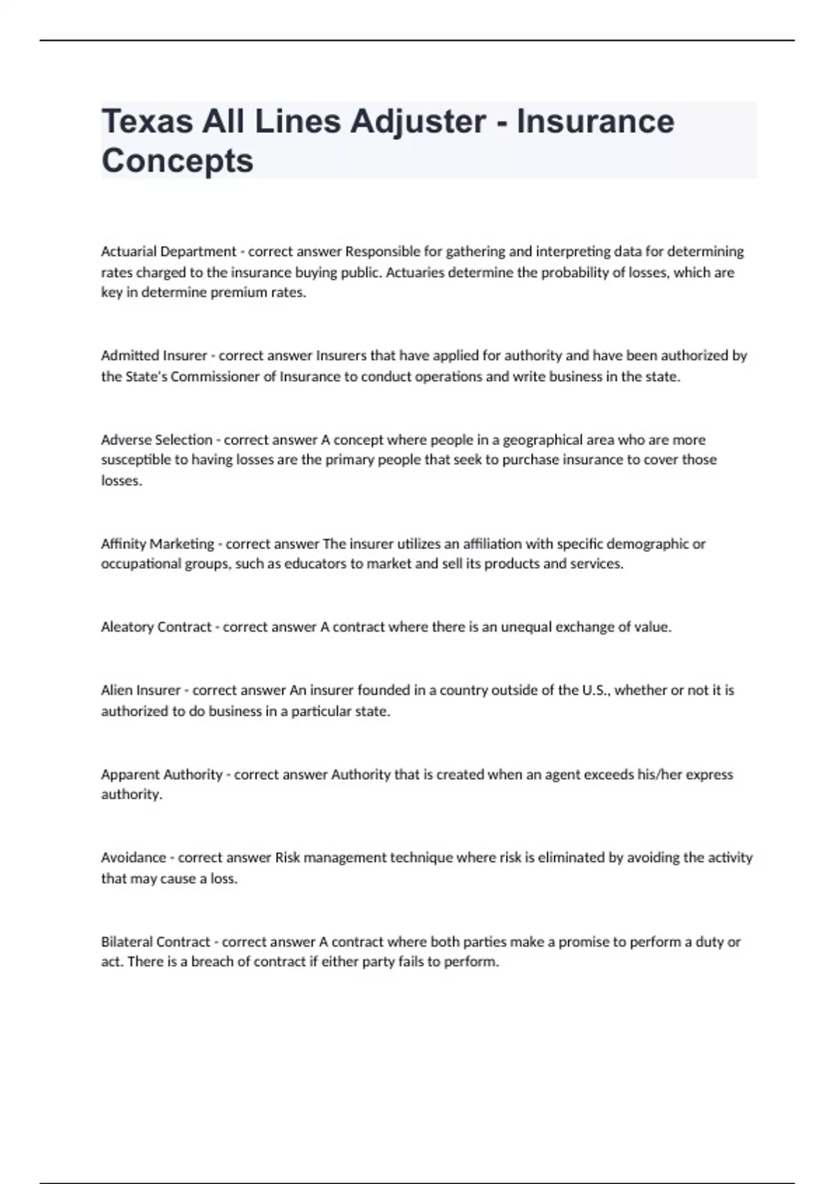 Texas All Lines Adjuster - Insurance ConceptsActuarial Department - correct answer Responsible for gathering and interpreting data for determining rates charged to the insurance buying public. Actuaries determine the probability of losses, which are key in determine premium rates. Admitted Insurer - correct answer Insurers that have applied for authority and have been authorized by the State's Commissioner of Insurance to conduct operations and write business in the state. Adverse Selection - correct answer A concept where people in a geographical area who are more susceptible to having losses are the primary people that seek to purchase insurance to cover those losses. Affinity Marketing - correct answer The insurer utilizes an affiliation with specific demographic or occupational groups, such as educators to market and sell its products and services. Aleatory Contract - correct answer A contract where there is an unequal exchange of value. Alien Insurer - correct answer An insurer founded in a country outside of the U.S., whether or not it is authorized to do business in a particular state. Apparent Authority - correct answer Authority that is created when an agent exceeds his/her express authority. Avoidance - correct answer Risk management technique where risk is eliminated by avoiding the activity that may cause a loss. Bilateral Contract - correct answer A contract where both parties make a promise to perform a duty or act. There is a breach of contract if either party fails to perform.