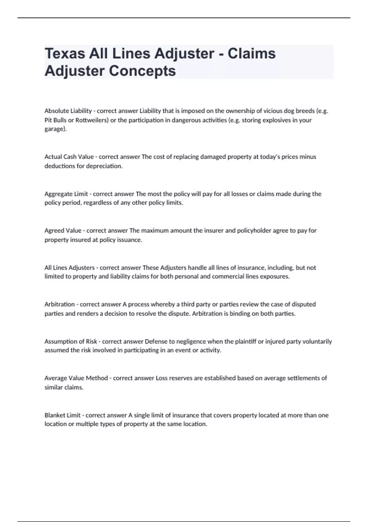Texas All Lines Adjuster - Claims Adjuster ConceptsAbsolute Liability - correct answer Liability that is imposed on the ownership of vicious dog breeds (e.g. Pit Bulls or Rottweilers) or the participation in dangerous activities (e.g. storing explosives in your garage). Actual Cash Value - correct answer The cost of replacing damaged property at today's prices minus deductions for depreciation. Aggregate Limit - correct answer The most the policy will pay for all losses or claims made during the policy period, regardless of any other policy limits. Agreed Value - correct answer The maximum amount the insurer and policyholder agree to pay for property insured at policy issuance. All Lines Adjusters - correct answer These Adjusters handle all lines of insurance, including, but not limited to property and liability claims for both personal and commercial lines exposures. Arbitration - correct answer A process whereby a third party or parties review the case of disputed parties and renders a decision to resolve the dispute. Arbitration is binding on both parties. Assumption of Risk - correct answer Defense to negligence when the plaintiff or injured party voluntarily assumed the risk involved in participating in an event or activity. Average Value Method - correct answer Loss reserves are established based on average settlements of similar claims. Blanket Limit - correct answer A single limit of insurance that covers property located at more than one location or multiple types of property at the same location.